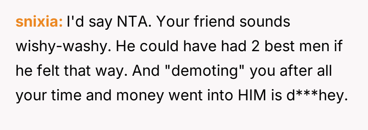 The original poster (OP) experienced a significant reversal of roles after investing substantial time and money into planning the bachelor party, leading to feelings of being unappreciated when the friend decided to replace him as best man.