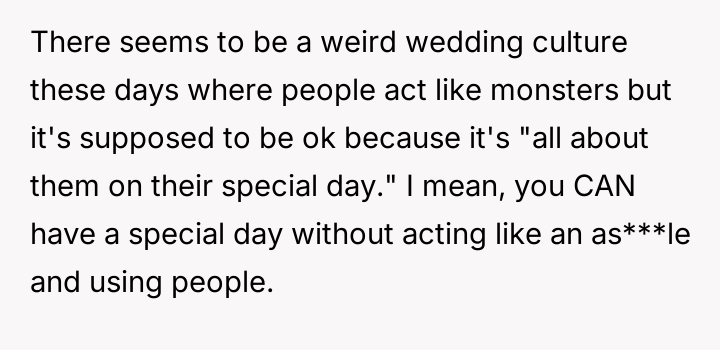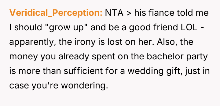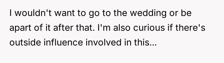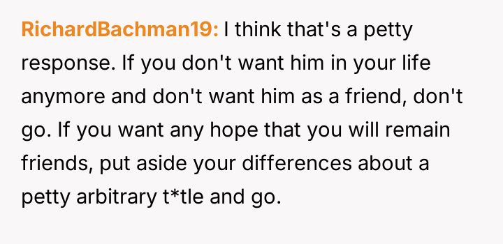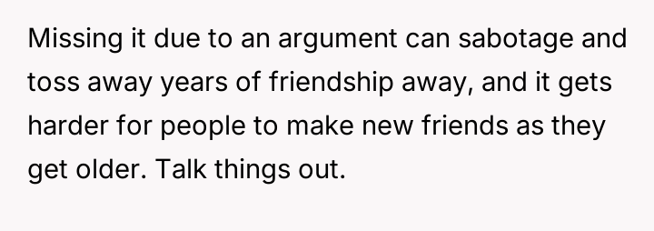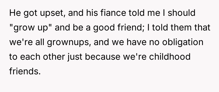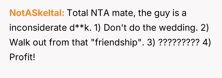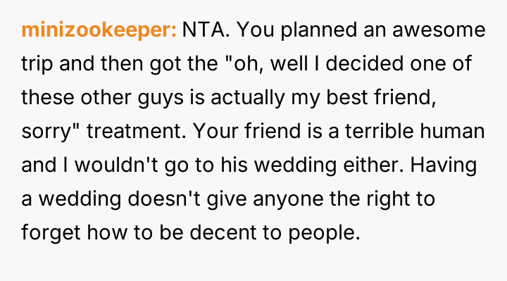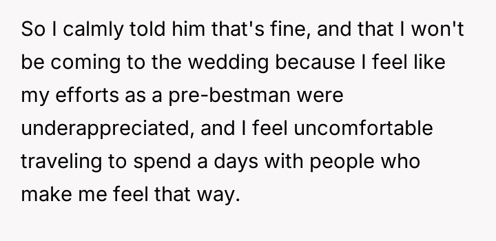 The OP reacted by withdrawing completely from the wedding attendance, asserting that adult friendships do not impose unbreakable obligations despite past history.