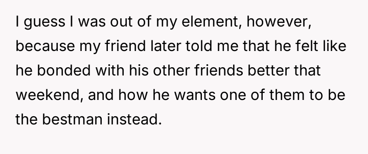The painful truth settled like a cold shadow: despite his efforts, he wasn’t the friend his best friend wanted by his side on the big day.