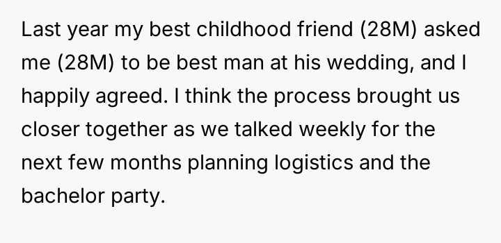 He had always believed their bond was unbreakable, forged in the fires of childhood and countless shared memories. When his best friend asked him to be the best man, it felt like the ultimate honor—a testament to years of loyalty and trust.