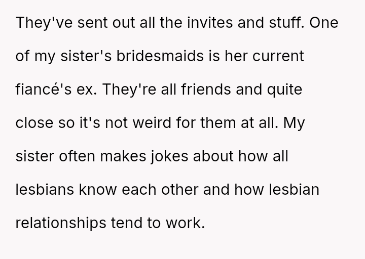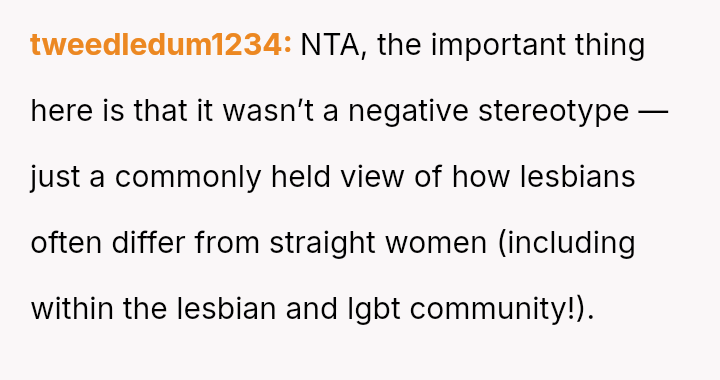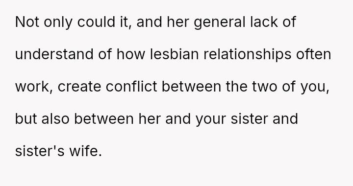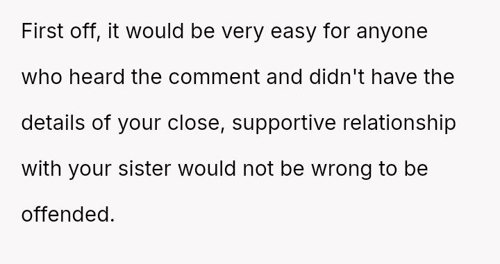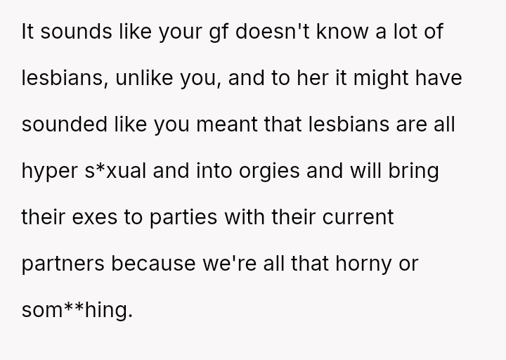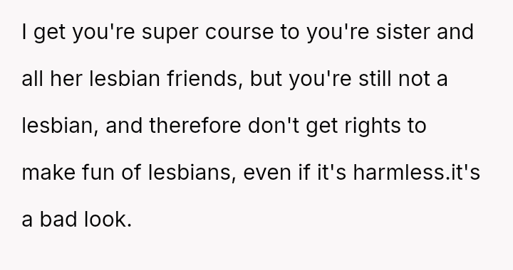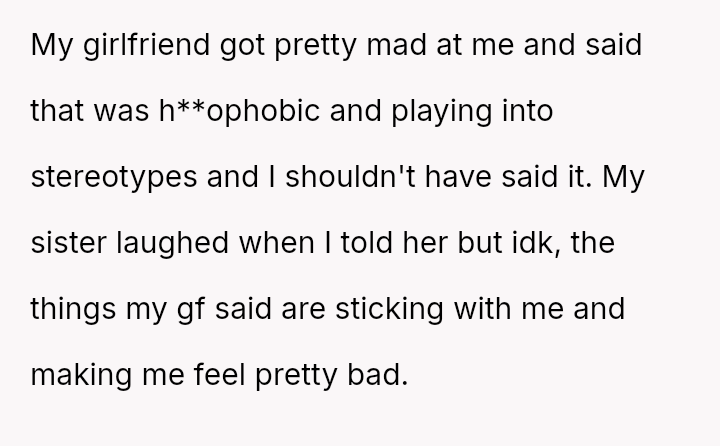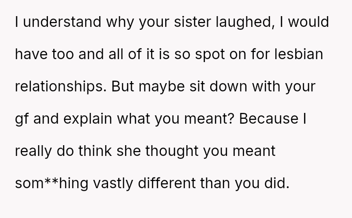 The original poster feels conflicted because their dismissive response about their sister's relationship choices—attributing them simply to being 'lesbians'—has caused significant upset with their girlfriend, who interpreted the comment as h**ophobic and stereotyping.