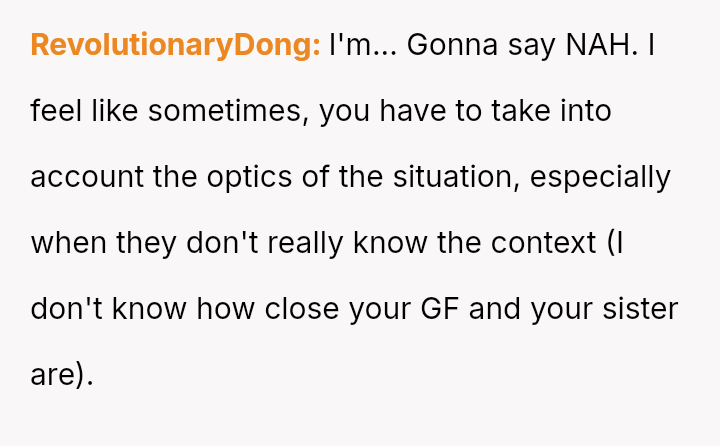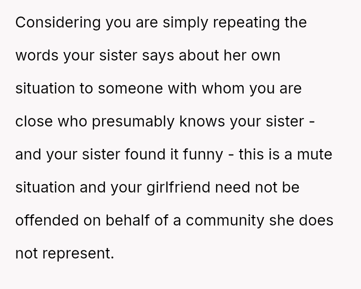 The central conflict lies between the OP's casual acceptance (or perhaps lack of deep thought) regarding their sister's social dynamics and their girlfriend's expectation of sensitivity regarding potentially harmful generalizations.