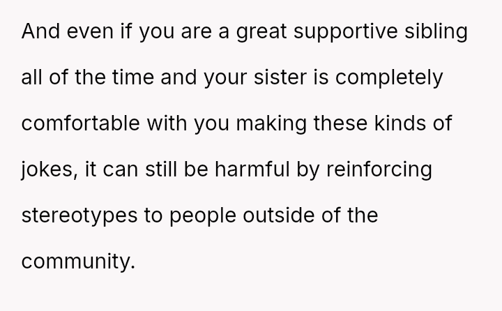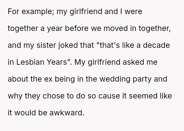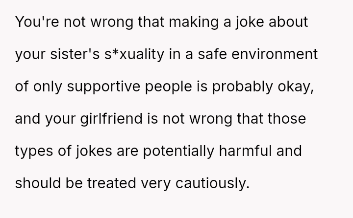 Was the original poster's casual, shorthand explanation regarding their sister's social circle and the inclusion of the ex-partner a harmless joke reflecting in-group understanding, or did this reliance on generalization cross a line into harmful stereotyping that invalidated their girlfriend's concerns?