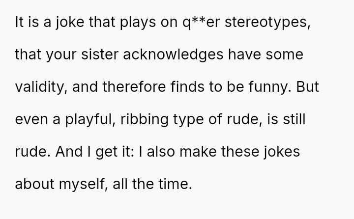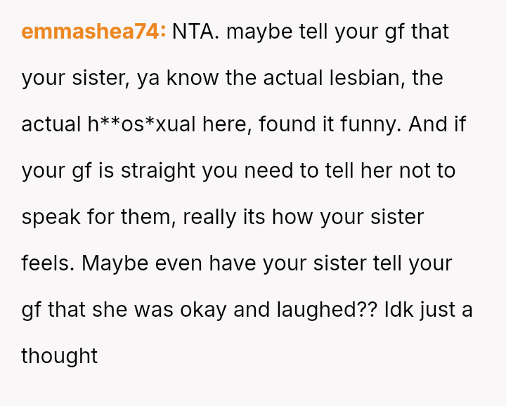 Should the OP prioritize defending their sister's lifestyle or validating their girlfriend's perception of h**ophobia in the comment?