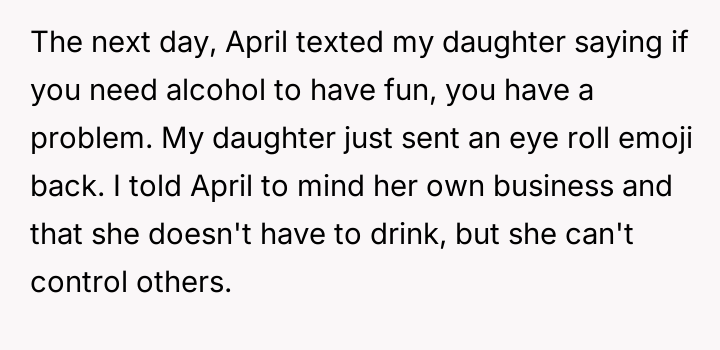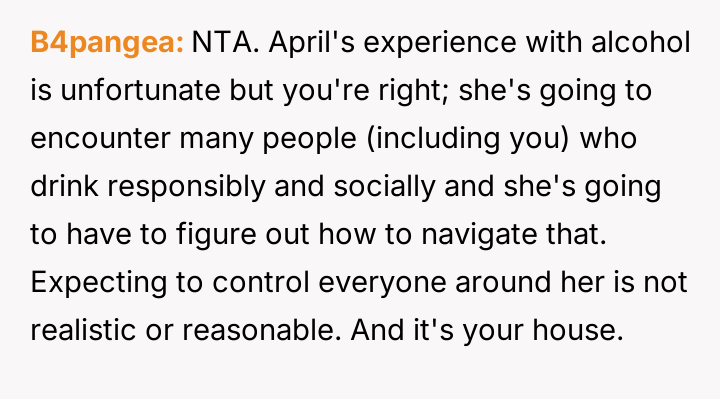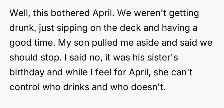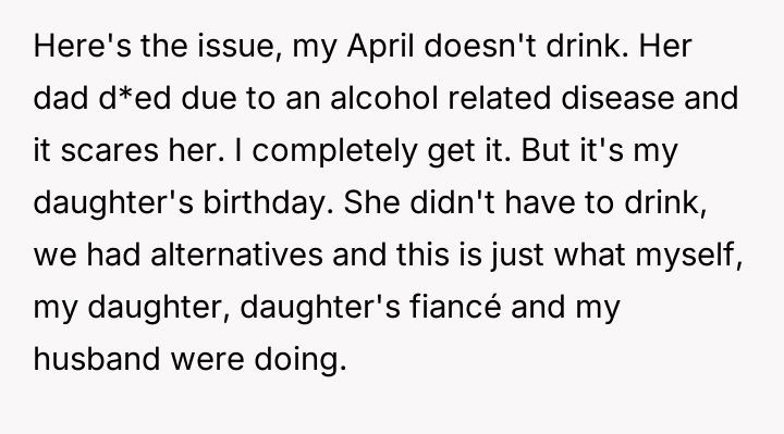 The core conflict revolves around the OP prioritizing their daughter's birthday celebration, which included moderate alcohol consumption, over the stated discomfort of their son's girlfriend, April, who has a strong aversion to alcohol due to past family trauma.