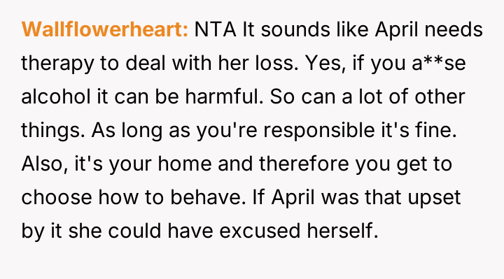 Given the OP's firm stance that April cannot dictate the behavior of others in their home versus April's deeply rooted trauma making the environment genuinely distressing, the central question remains: Where should the boundary lie when one person's completely legal, moderate activity directly conflicts with another person's serious, trauma-based anxiety, especially within a shared living situation?