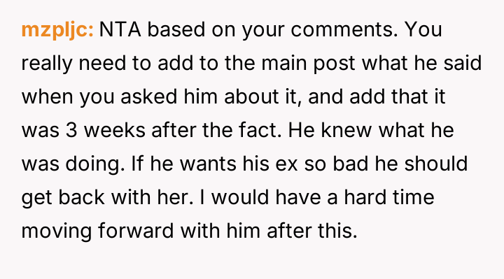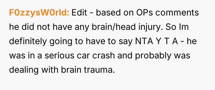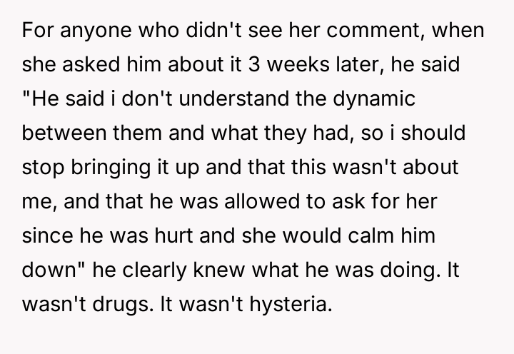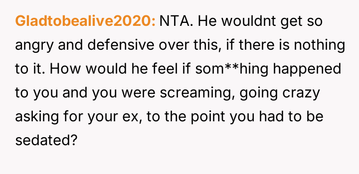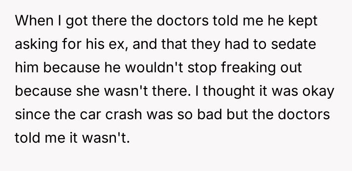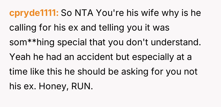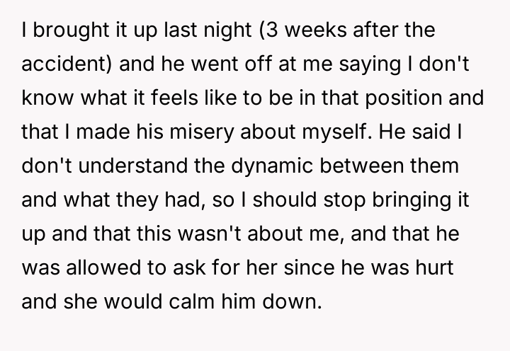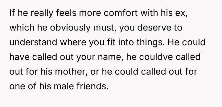 The original poster (OP) is struggling with significant emotional distress after learning her husband asked for his ex-partner while severely injured and later dismissed her feelings about the incident.