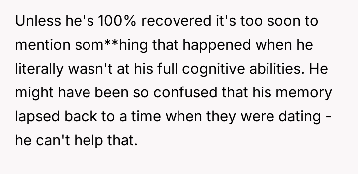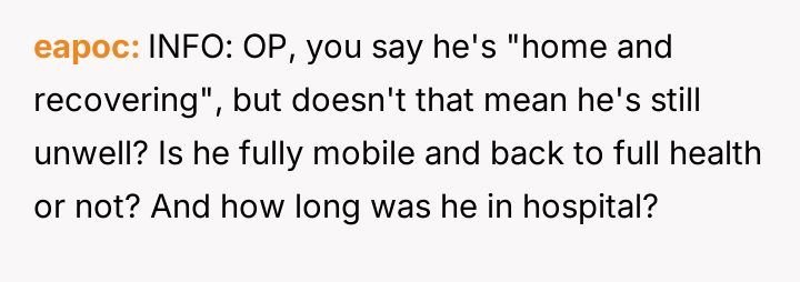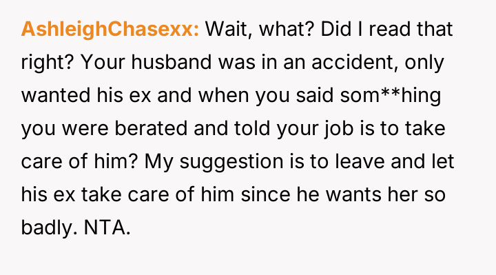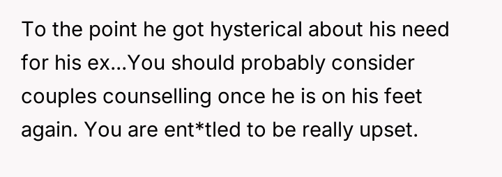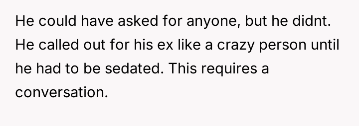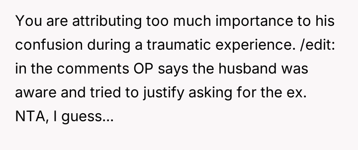 Considering the OP's dedication to care versus the husband's defense of his request rooted in past emotional connection, the core question remains: Is the OP overreacting by voicing her feelings about a traumatic incident, or does her partner owe her consideration and validation regarding his explicit request for another woman during a medical crisis?