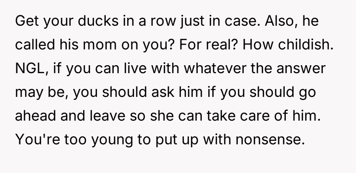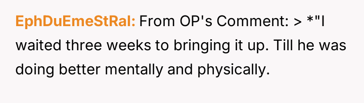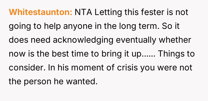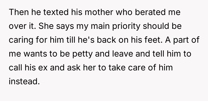 The central conflict lies between the OP's justifiable hurt and the husband's insistence that his past relationship dynamic overrides her current emotional needs, especially when she is actively providing care.