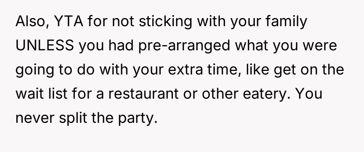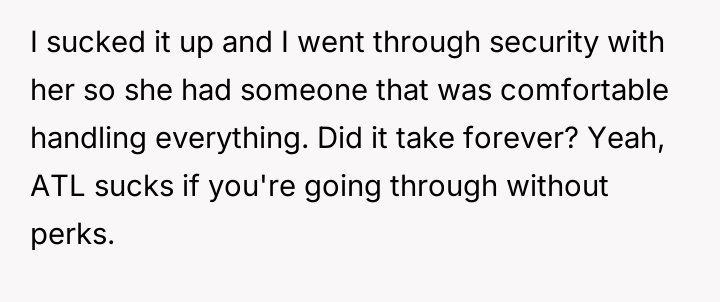 The original poster (OP) faces a conflict between personal convenience, which they paid for via TSA PreCheck, and a perceived obligation to share the family experience, even the tedious parts, with their wife and children during a significant family trip.