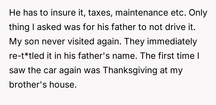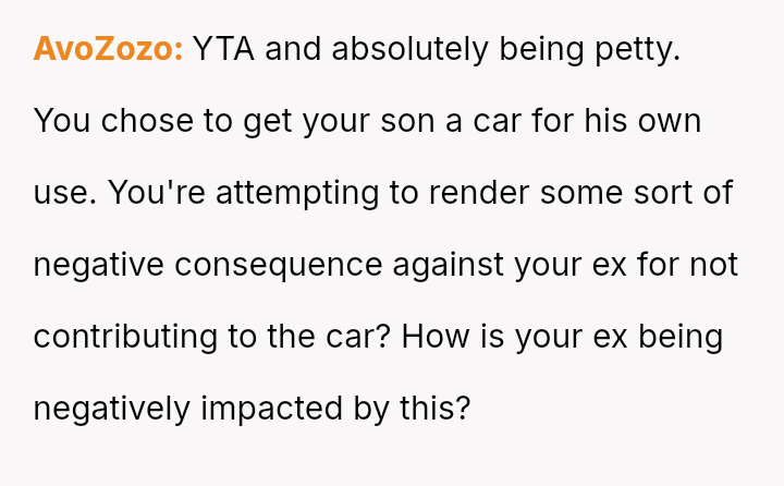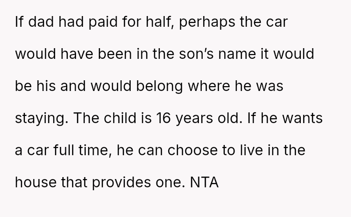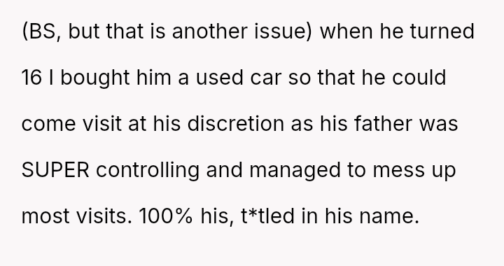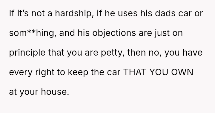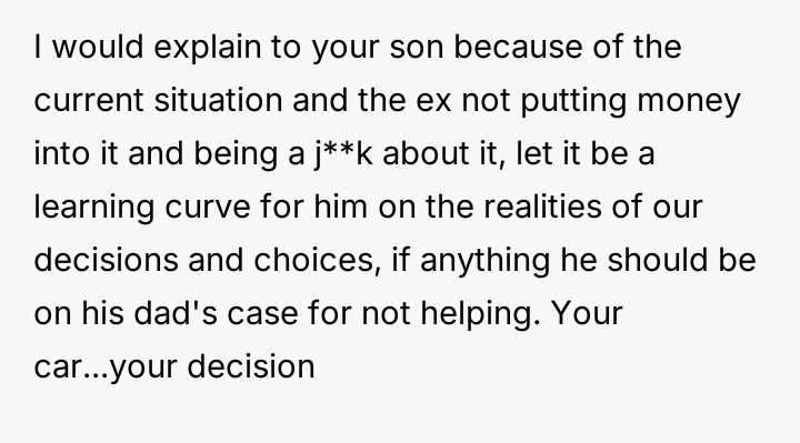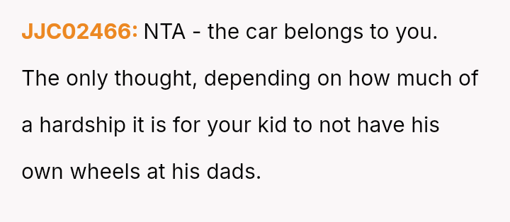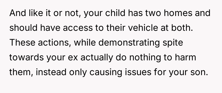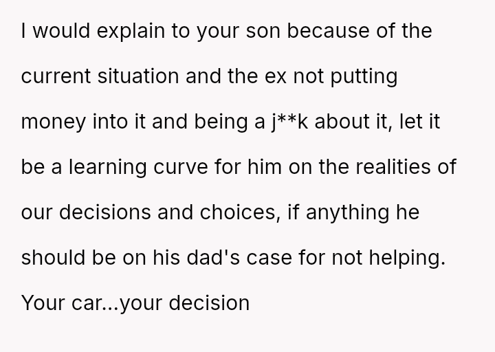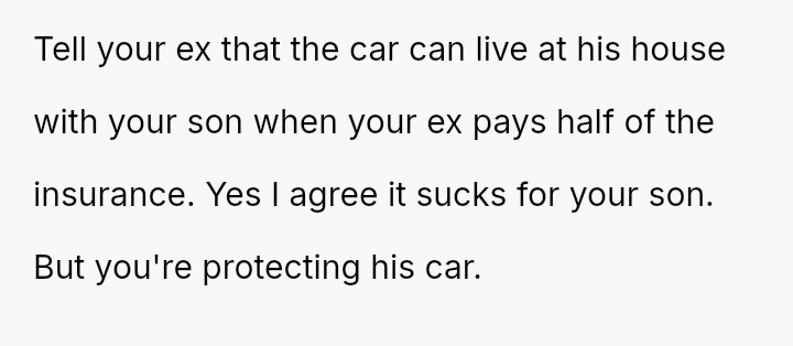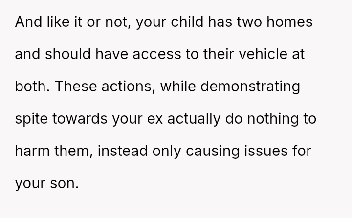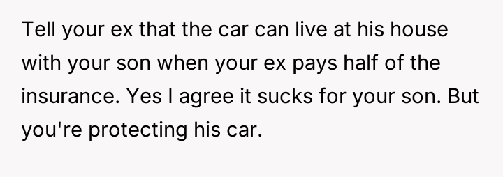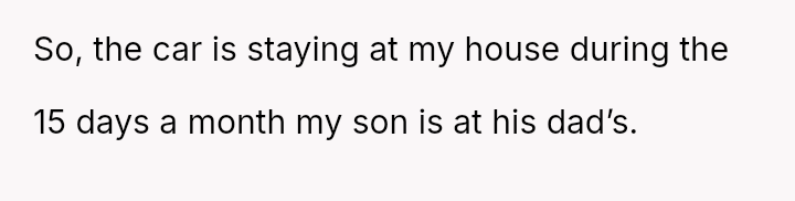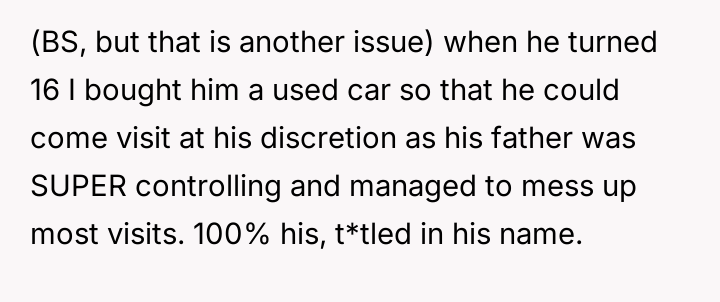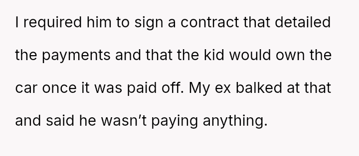 When the ex-husband refused to contribute financially and balked at a contract ensuring the son eventually owned the vehicle, the OP kept the car at their residence during the ex-husband's custody time, leading to conflict with the son.