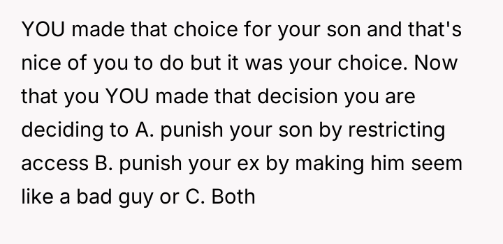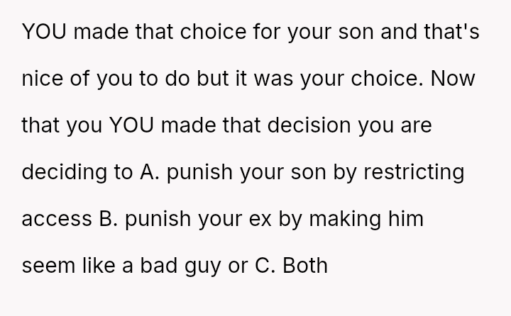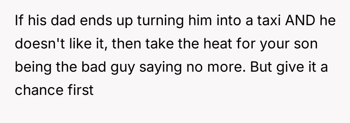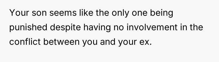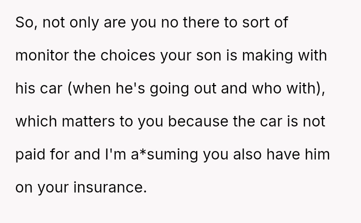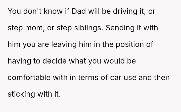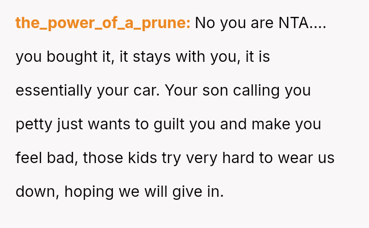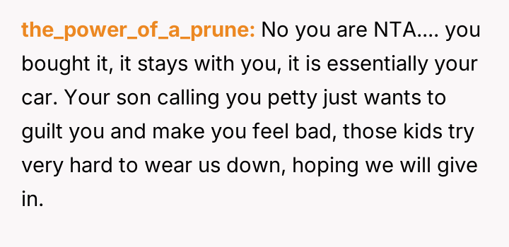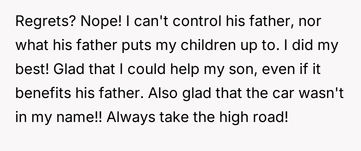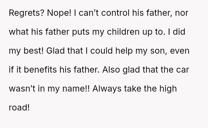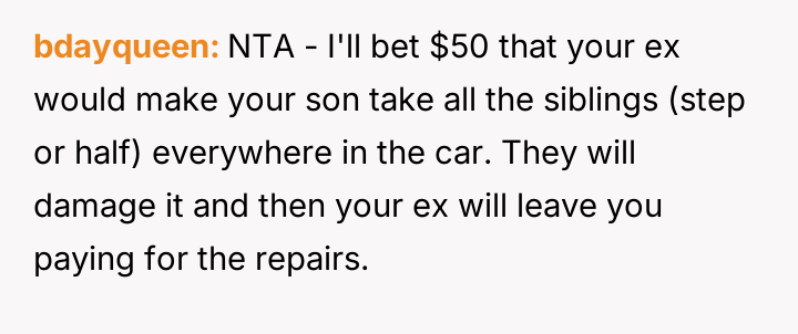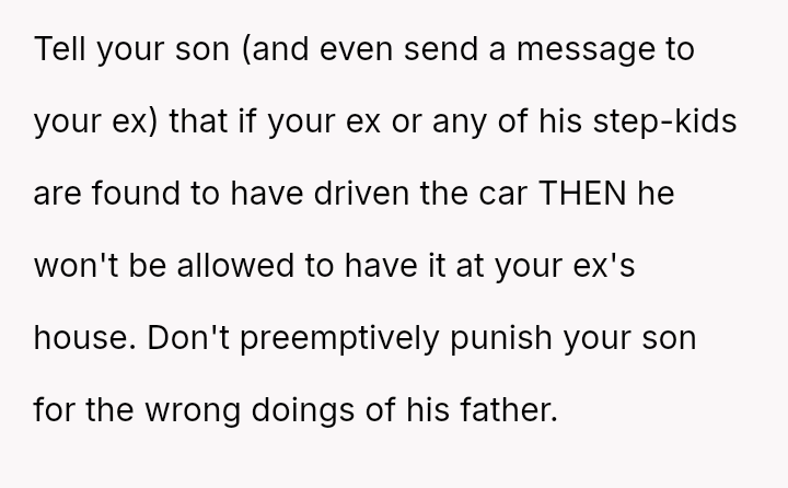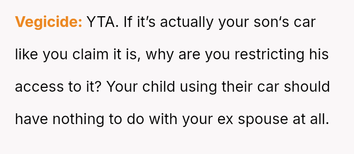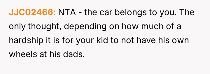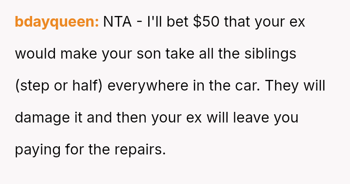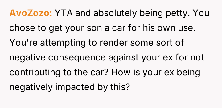 When the ex-husband refused to contribute financially and balked at a contract ensuring the son eventually owned the vehicle, the OP kept the car at their residence during the ex-husband's custody time, leading to conflict with the son.