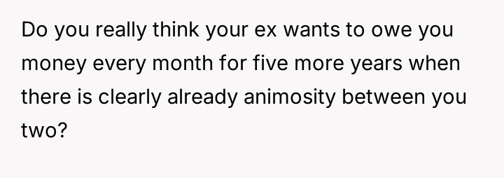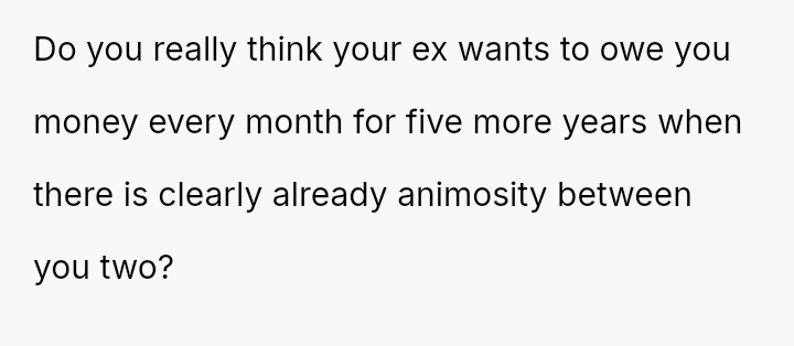 Unable to secure cooperation, the OP unilaterally purchased the car and then offered the ex-husband a structured, interest-free payment plan to share ownership.