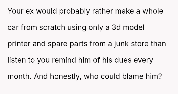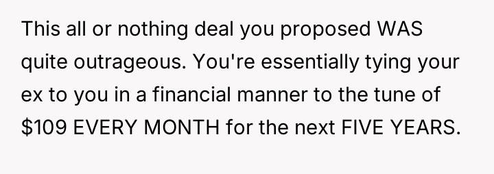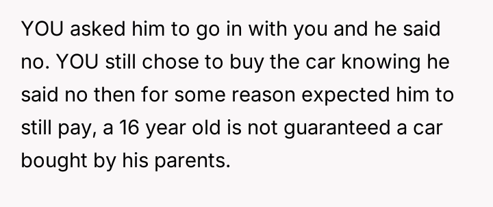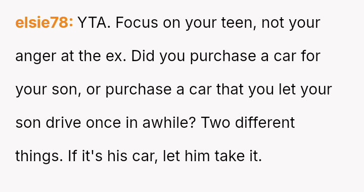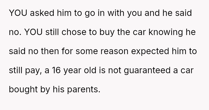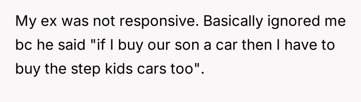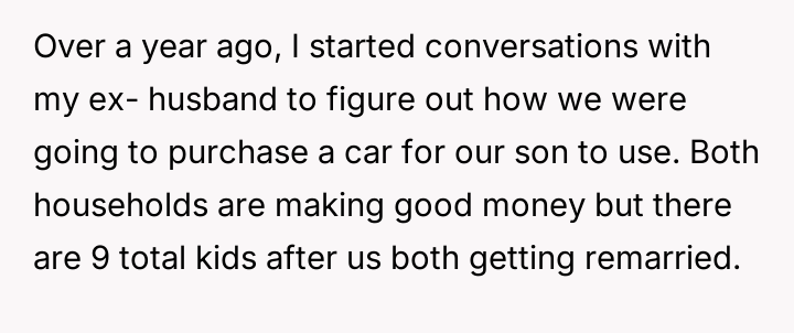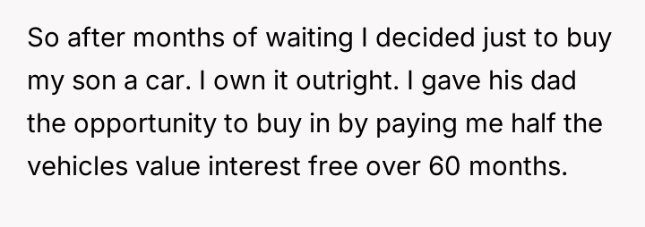 The original poster (OP) faced a d**dlock with their ex-husband regarding the shared responsibility of purchasing a car for their teenage son.