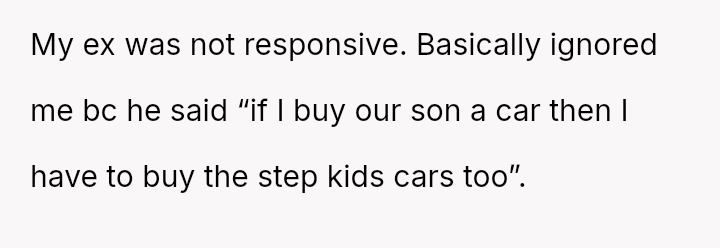 Despite their shared love for their son, the struggle over som**hing as simple as a car becomes a battlefield where fairness, responsibility, and the weight of blended families collide.