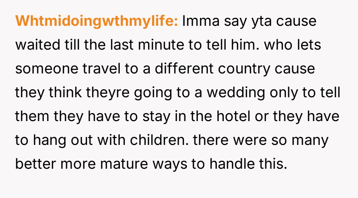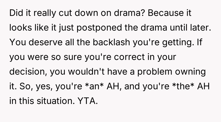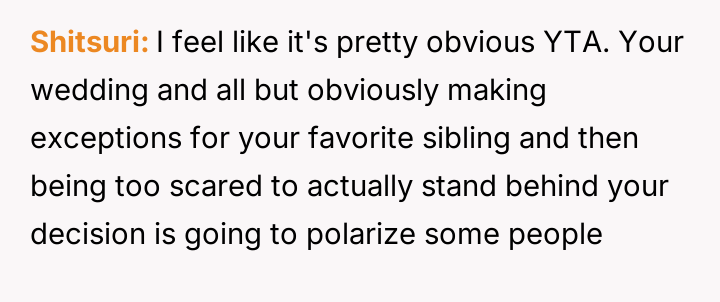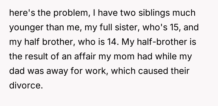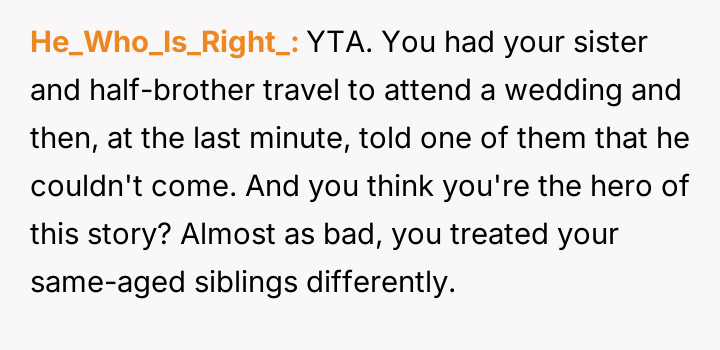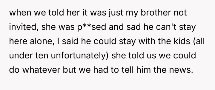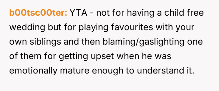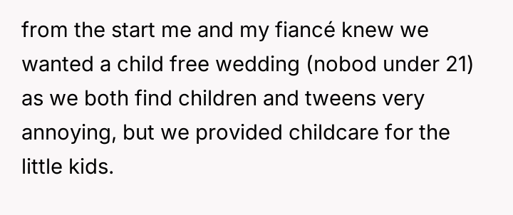 The original poster (OP) faced a direct conflict between their desire for an adult-only wedding and the expectation from their mother to include their younger half-brother, leading to significant family tension after the decision was enforced.