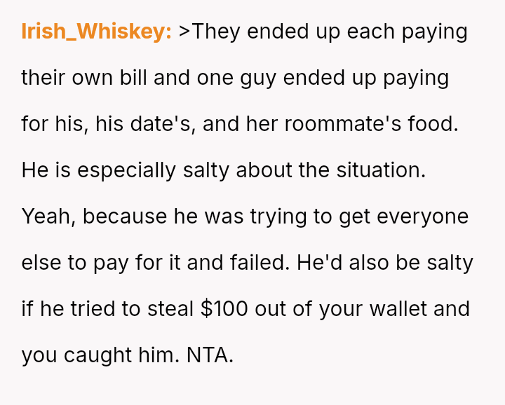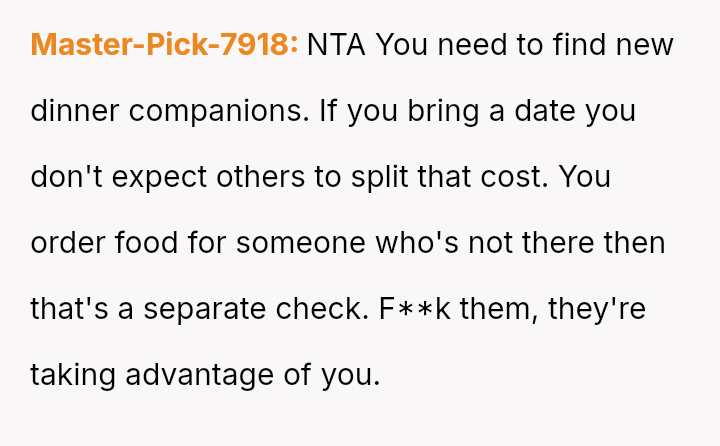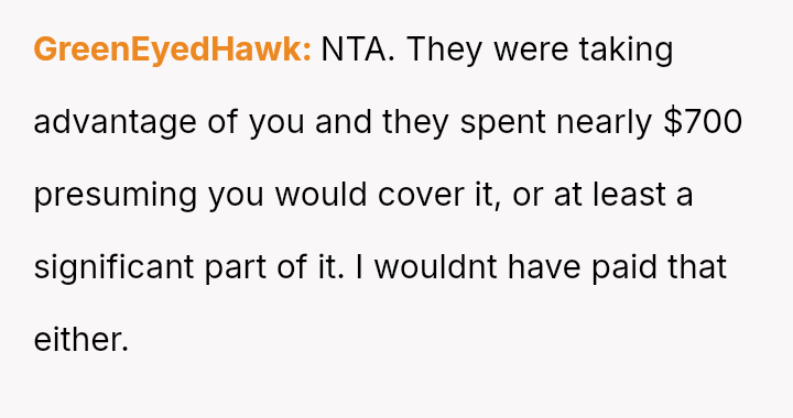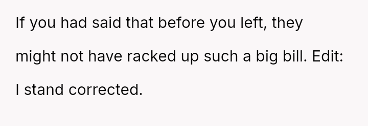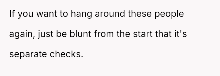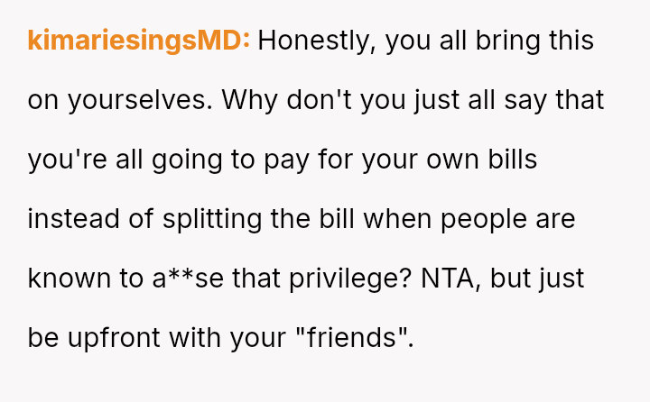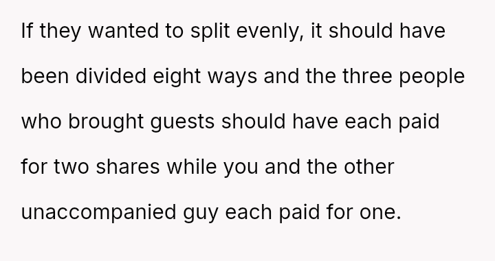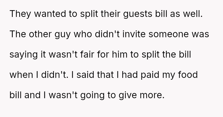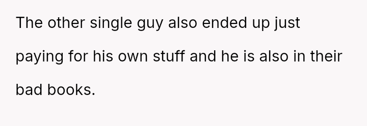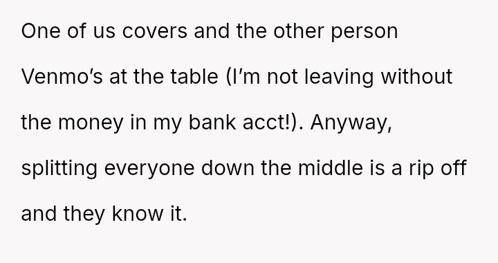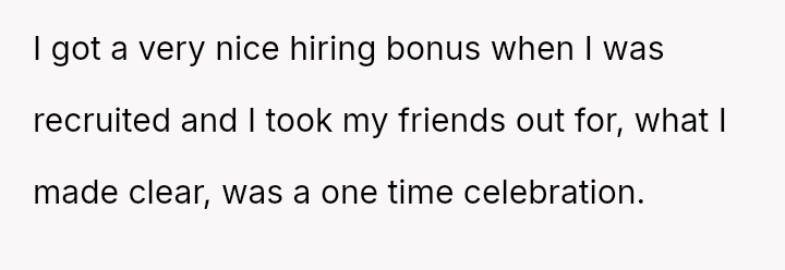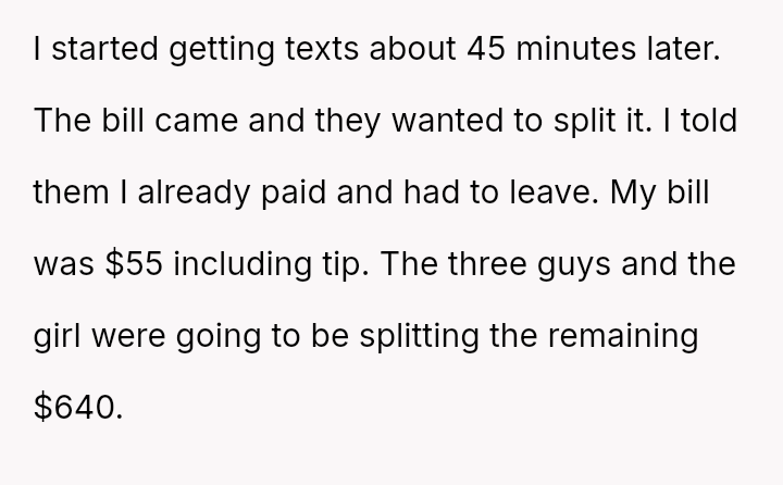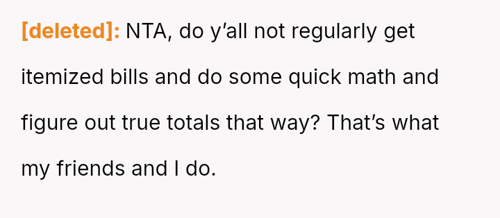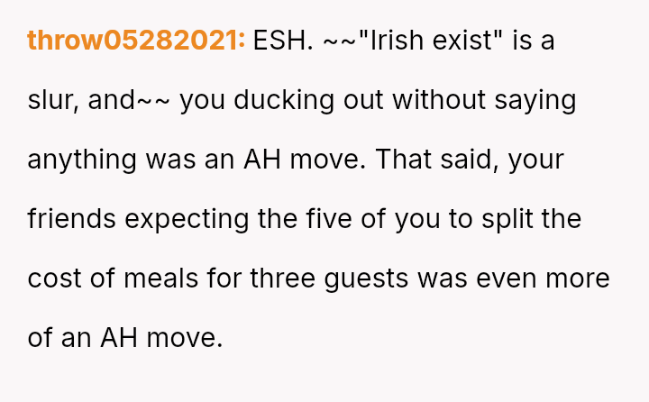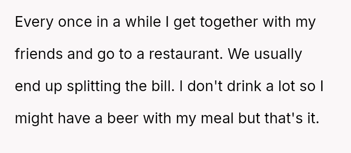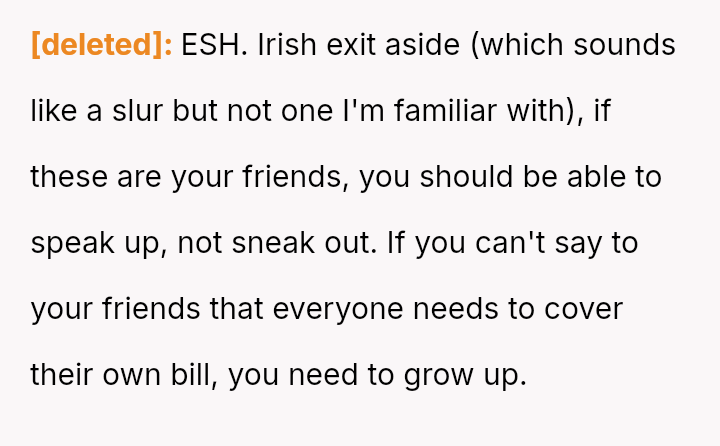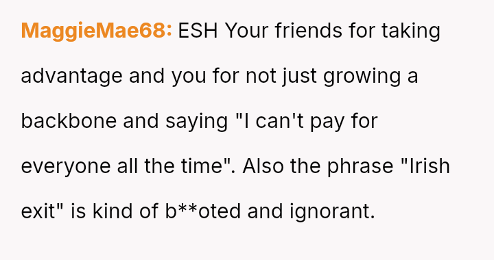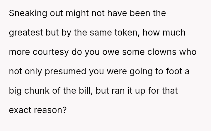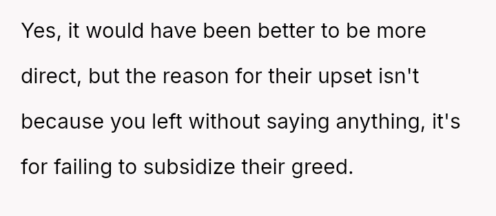 Conversely, the friends feel slighted because the OP departed before the final, large bill was settled, leading to an uneven distribution of the remaining high costs, which the OP effectively avoided subsidizing.