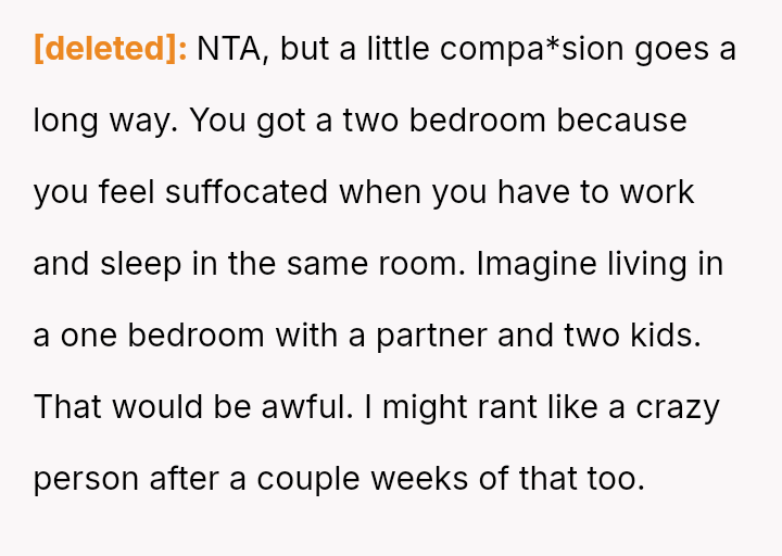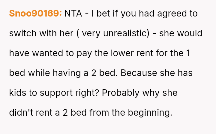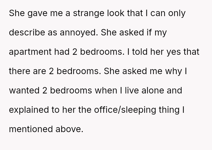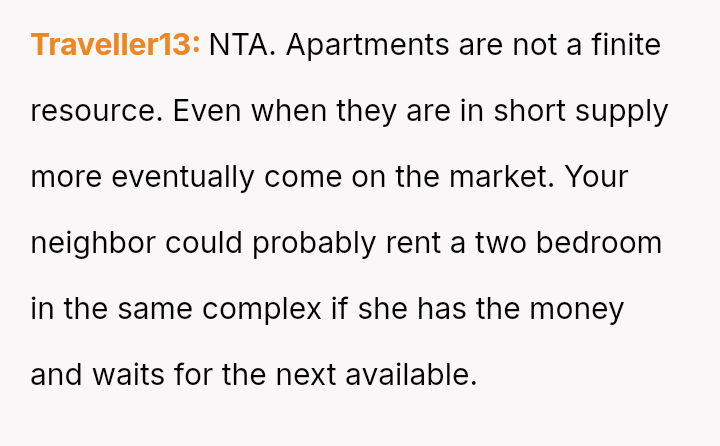 The original poster (OP) is facing conflict because they prioritized their personal mental health and work boundaries by securing a two-bedroom apartment for themselves and their home office, which directly clashes with the neighbor's strong belief that such spaces should be reserved for larger families due to perceived scarcity.