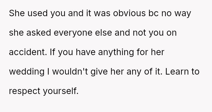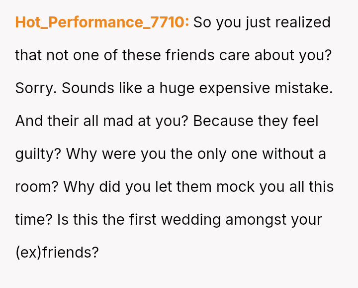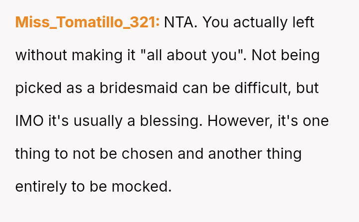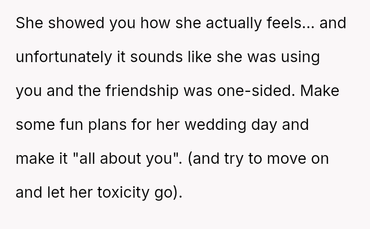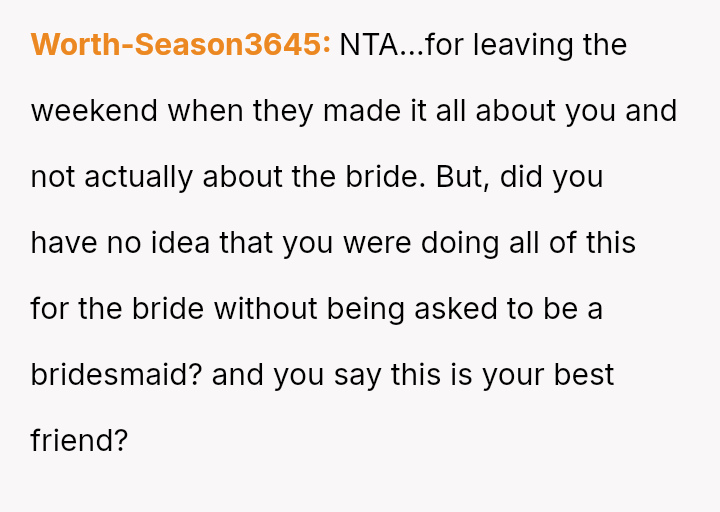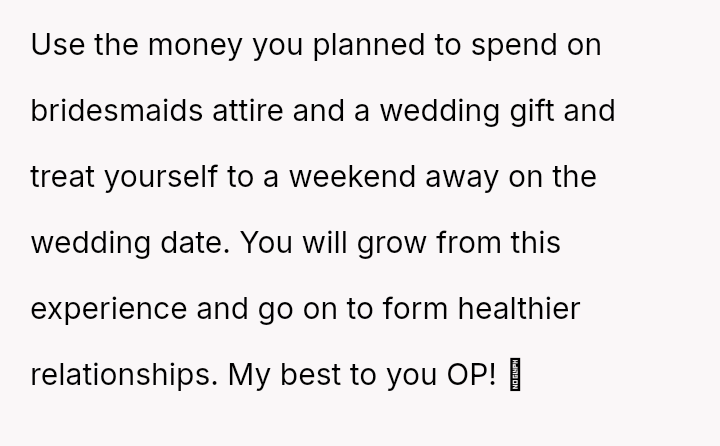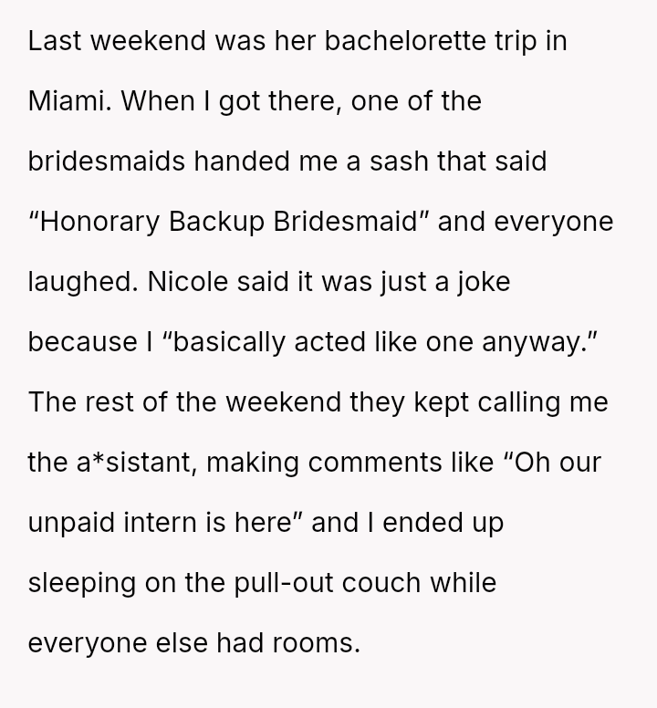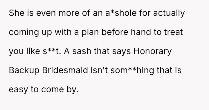 The original poster (OP) experienced a significant emotional letdown after investing considerable time, effort, and money into supporting their best friend's wedding planning, only to be publicly minimized and designated as an "Honorary Backup Bridesmaid" during the bachelorette party.