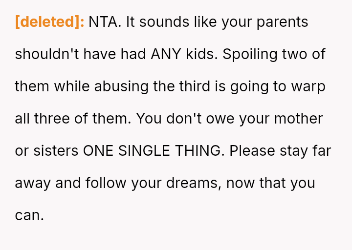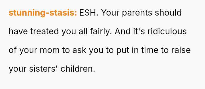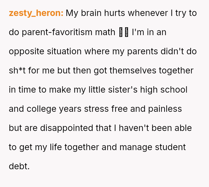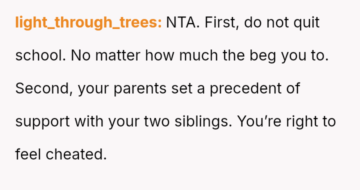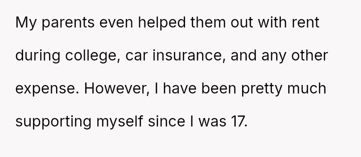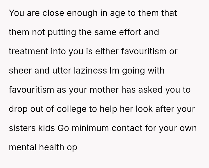 The core issue revolves around whether the OP is obligated to accept past inequities and current demands because her parents provided basic needs, or if her pursuit of education and independent future, free from familial obligation, is justified.