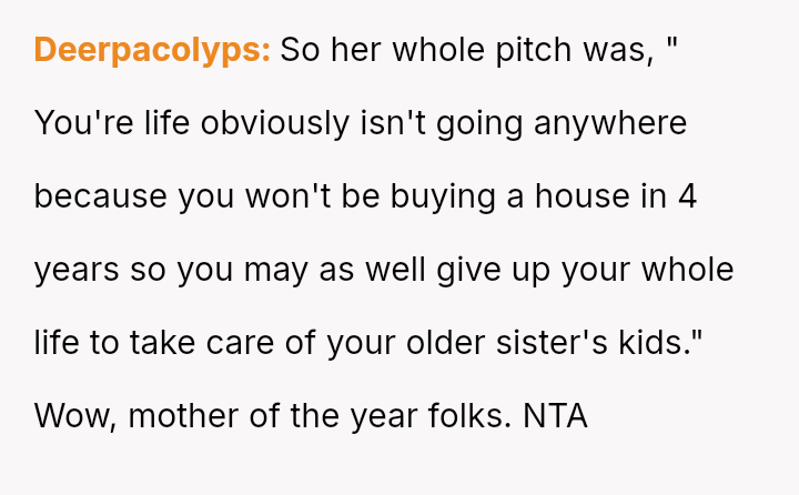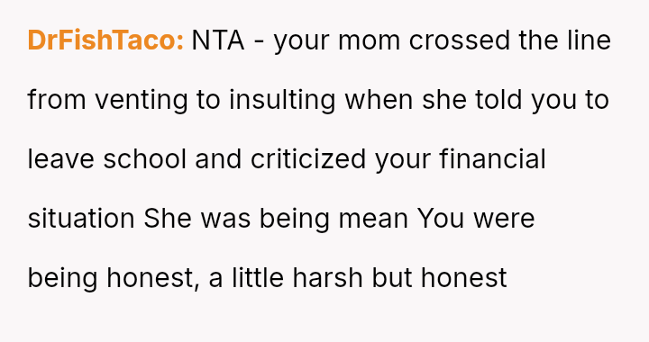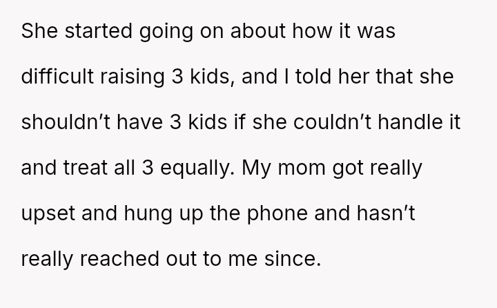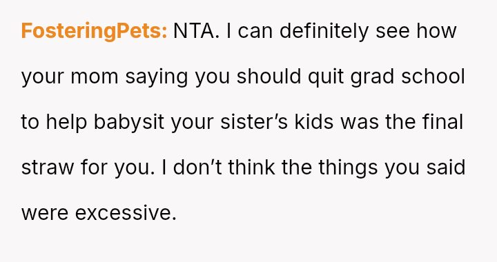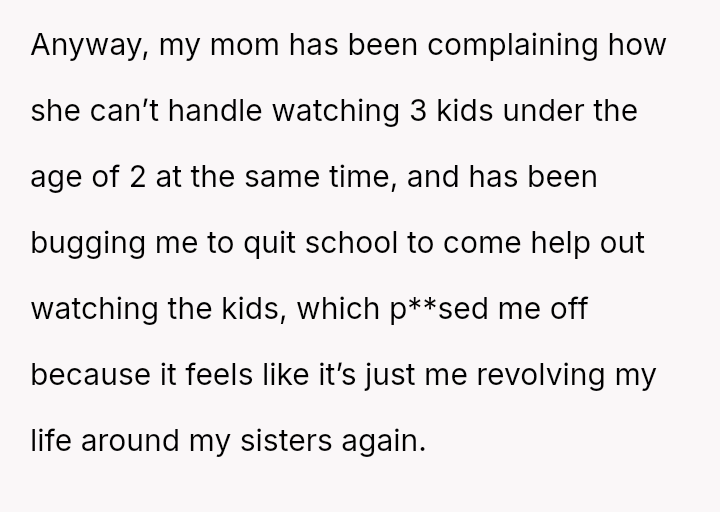 Her recent outburst, triggered by her mother demanding she sacrifice her education to provide childcare and comparing her financial status unfavorably to her sister's, highlights a conflict between her need for self-determination and her family's persistent expectation that she prioritize their needs over her own goals.