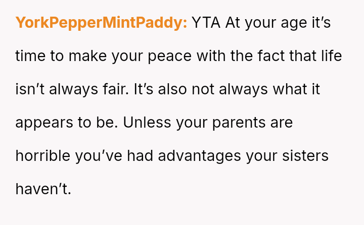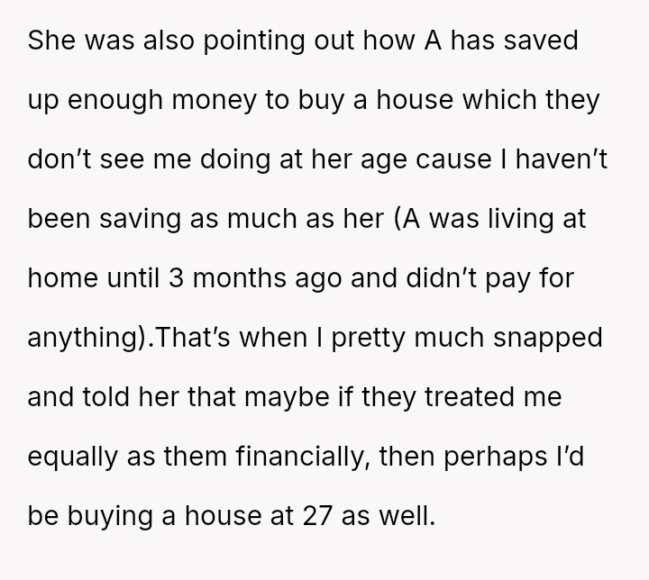 The original poster (OP) is grappling with deep-seated feelings of being undervalued and treated unequally compared to her older sisters throughout her life, particularly regarding financial support and parental attention.