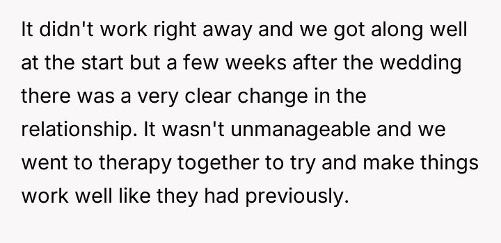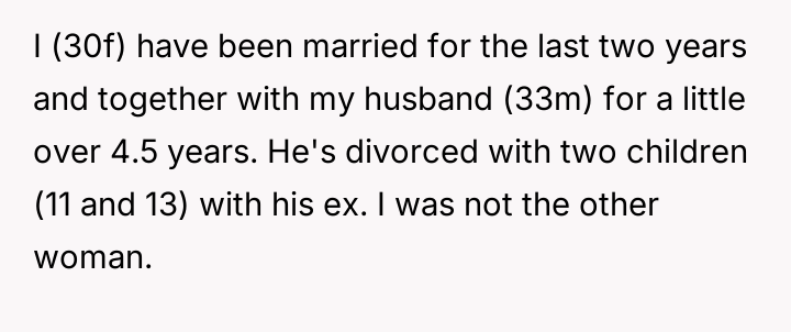 The user, a 30-year-old female, has been married to her 33-year-old husband for two years, having been together for over four and a half years. Her husband has two children, aged 11 and 13, from a previous marriage.