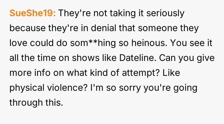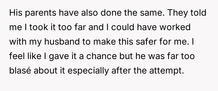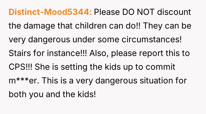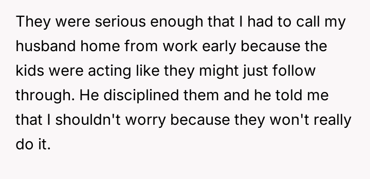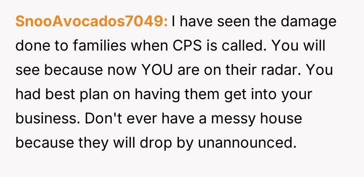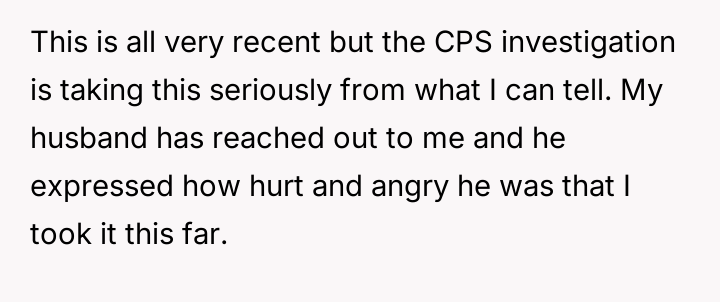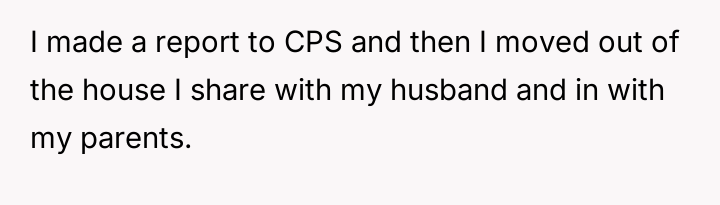 Following an attempt by the 11-year-old to act on these threats, the user reported the situation to Child Protective Services (CPS) and moved in with her parents, leaving her husband in doubt about her decision.