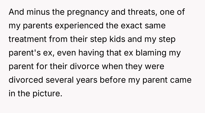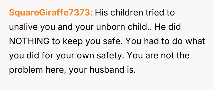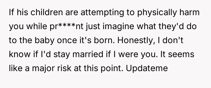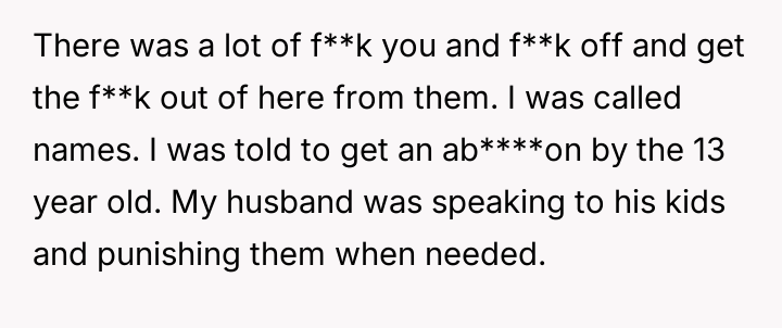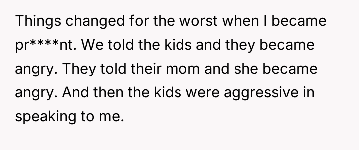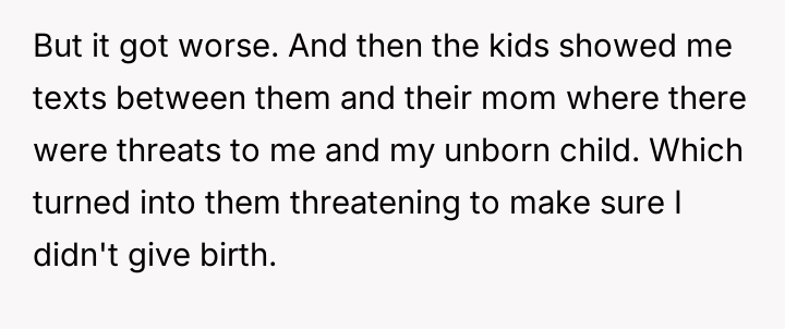 The husband's children reacted with anger, using aggressive language toward the user, including telling her to get an ab****on. The children showed the user text messages from their mother which contained threats against the user and her unborn child.