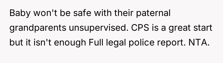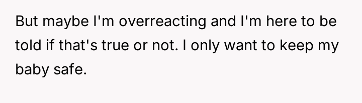 Her primary concern remains the safety of her child, which contrasts sharply with her husband's and his family's reaction that she 'took it too far.' The central debate revolves around whether the threat level warranted immediate protective action (reporting to CPS and separation) or if the situation should have been managed internally solely through the husband's discipline, especially given the husband's initial blasé reaction.
