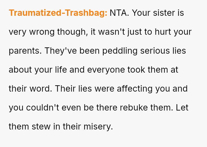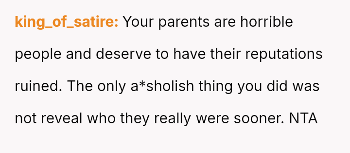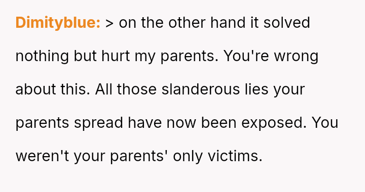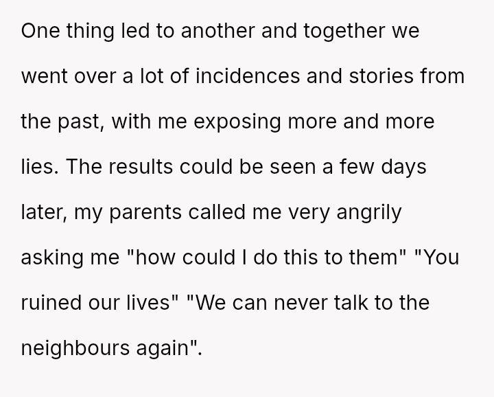 Given the long history of deception and the current emotional fallout, is the OP justified in completely dismantling his parents' reputation to live truthfully, or was there a more measured approach to setting boundaries that could have preserved some level of family connection without sacrificing personal integrity?