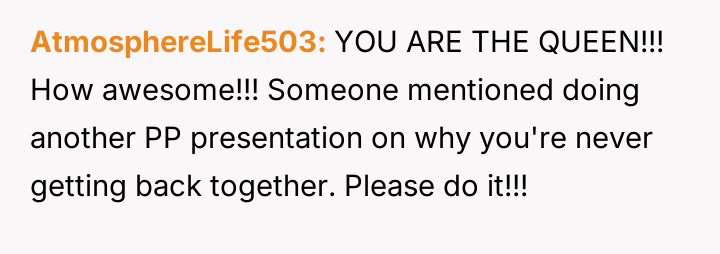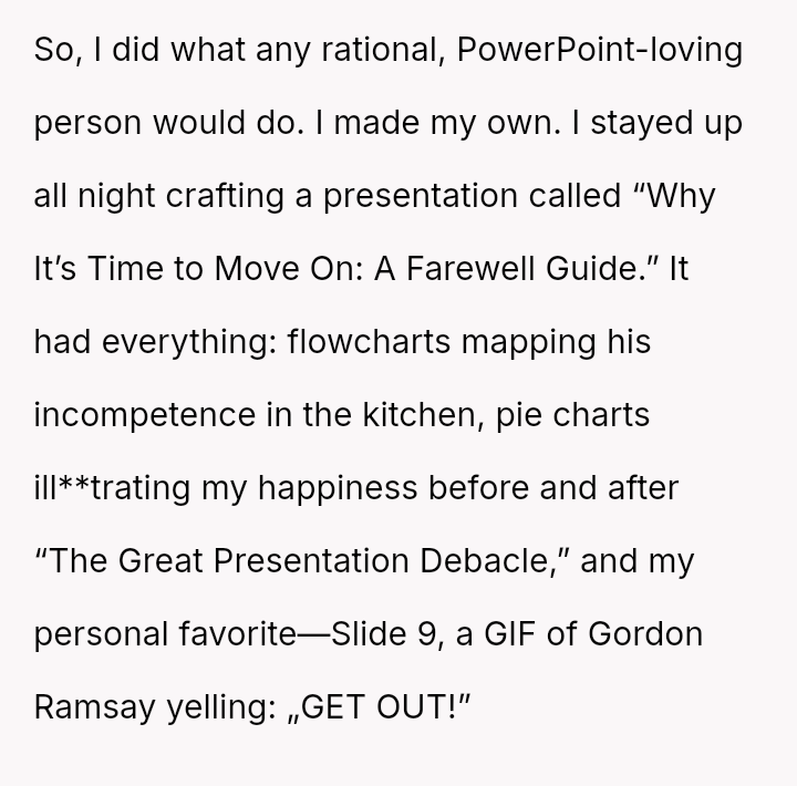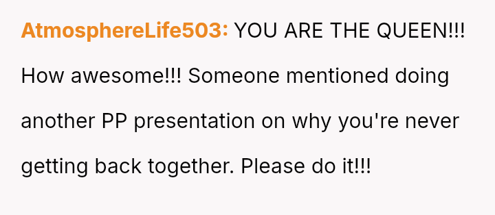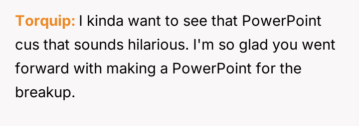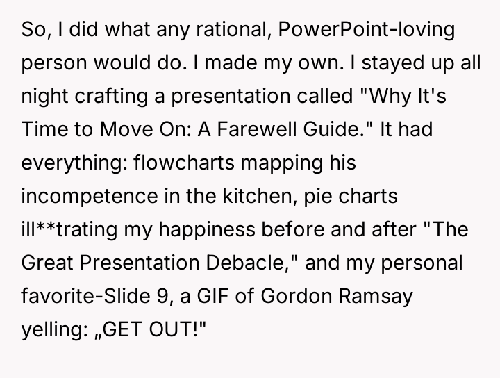 OP chose to mirror her ex-boyfriend's absurd communication style, turning the tables by creating her own detailed PowerPoint presentation outlining the reasons for their separation.
