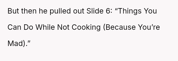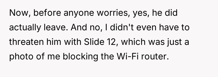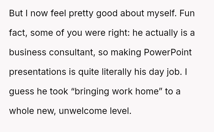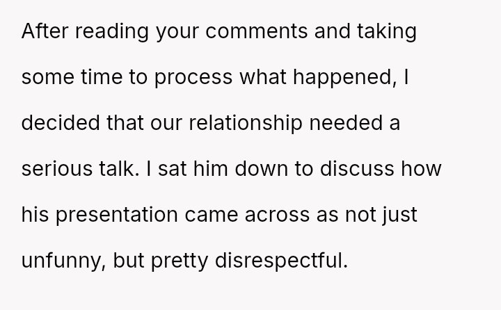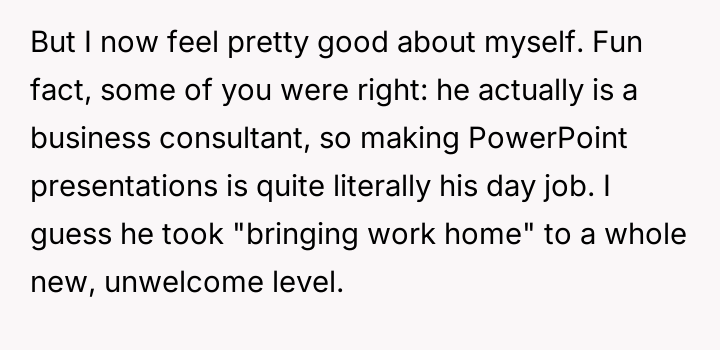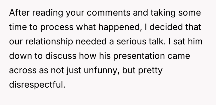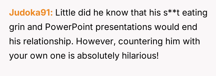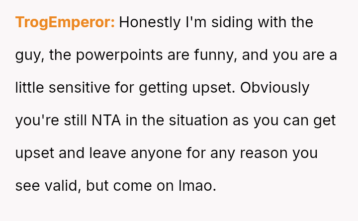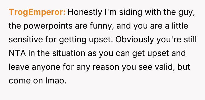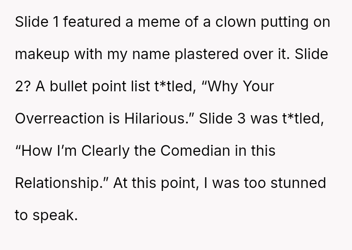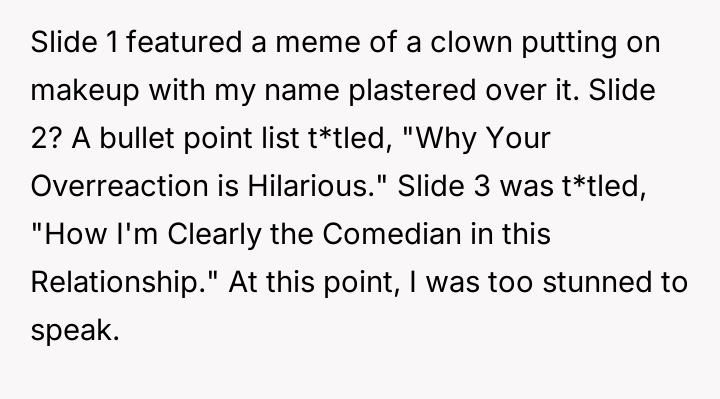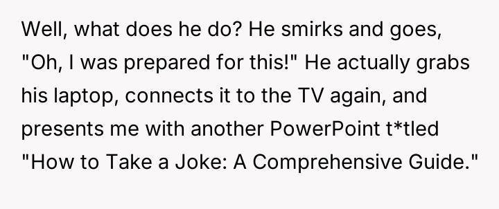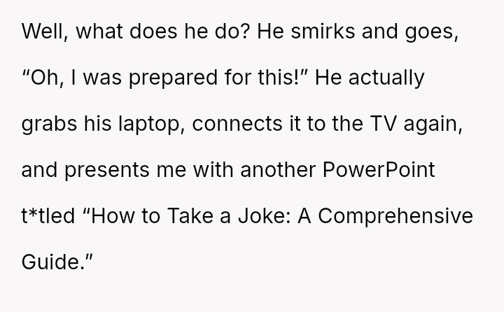 Instead of apologizing, the boyfriend revealed he had prepared a second presentation t*tled, “How to Take a Joke: A Comprehensive Guide,” complete with condescending memes and slides mocking OP’s reaction.
