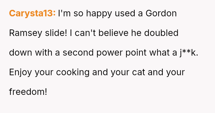 The Original Poster (OP) recently decided to address her now ex-boyfriend's highly inappropriate behavior: creating a formal PowerPoint presentation to critique her cooking.