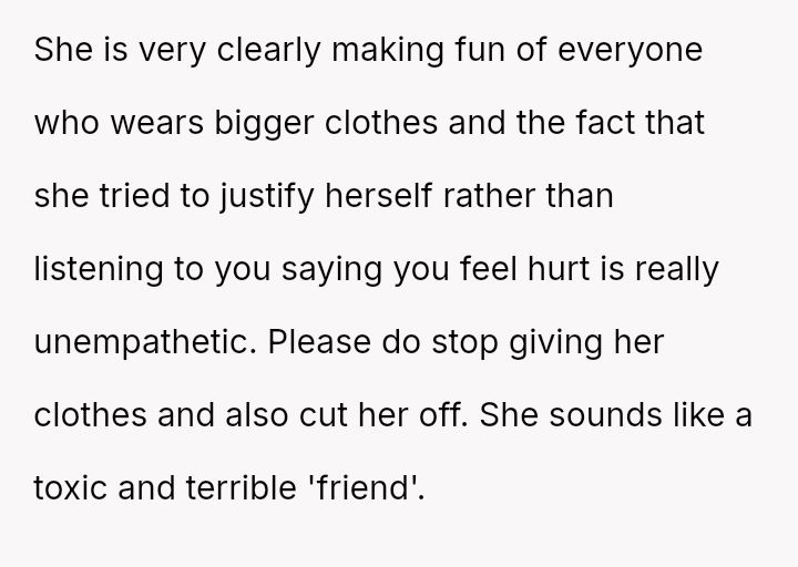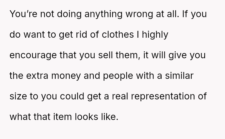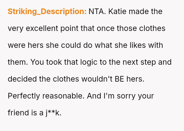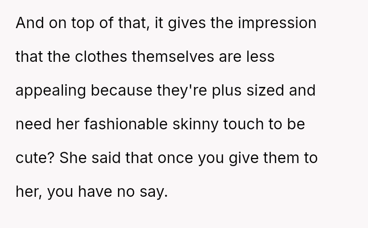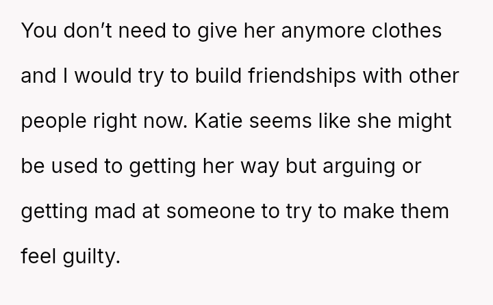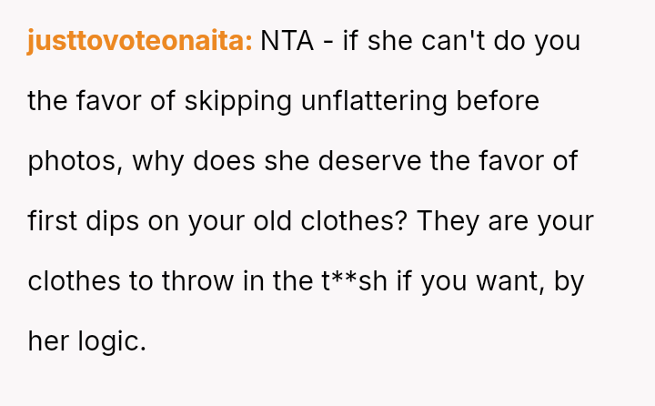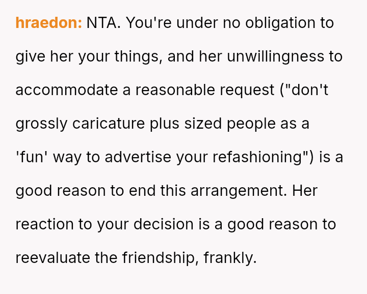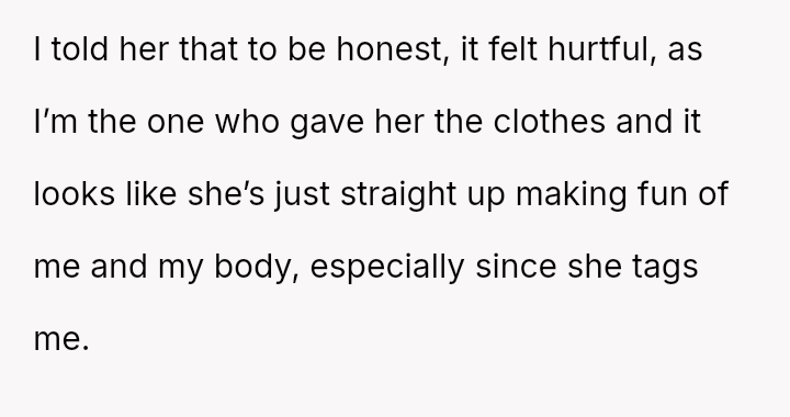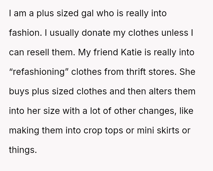 The original poster (OP) initially agreed to give her friend Katie access to her unwanted clothing for creative projects, but this arrangement soured when Katie used highly exaggerated, mocking facial expressions in 'before' photos that seemed to target the OP's plus-sized body.