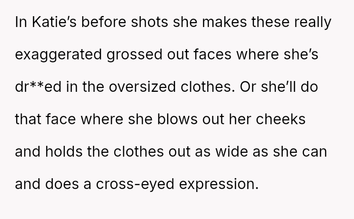 But excitement turned to hurt as she scrolled through Katie’s Instagram, where the refashioned pieces were showcased alongside exaggerated, mocking expressions and poses that twisted her joy into som**hing cruel.