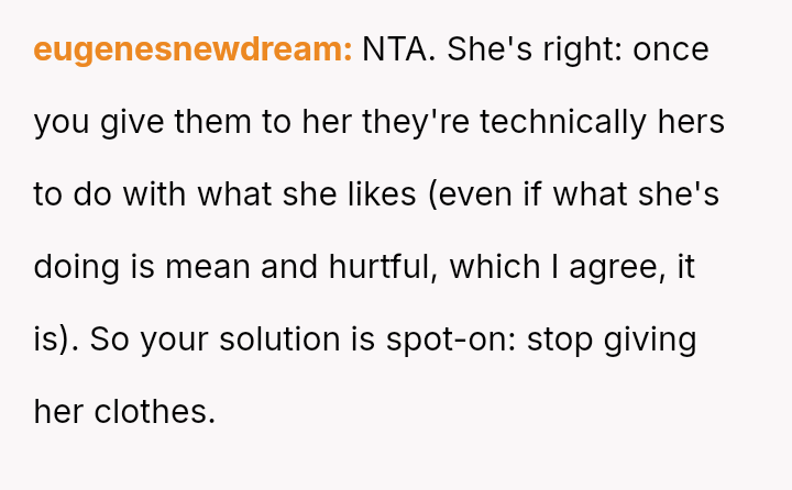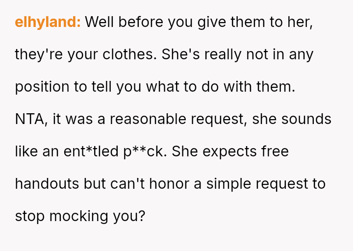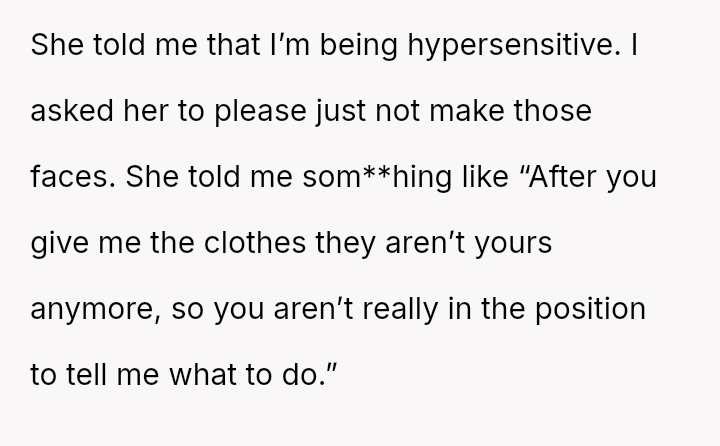 Was the OP justified in asking for basic respect concerning how the gifted items were presented, or did giving the clothes away truly forfeit all rights to comment on their subsequent use and display?