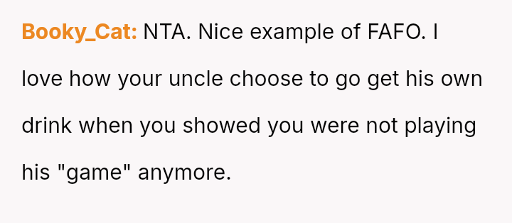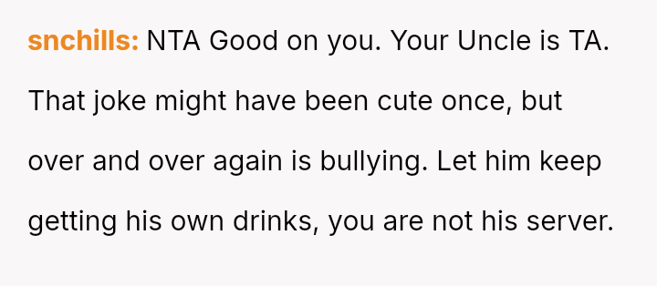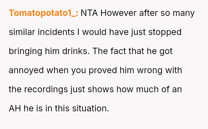 The Original Poster (OP) felt burdened by their uncle's repet*tive requests for drinks and his subsequent false claims, leading the OP to use recorded evidence to counter the deception.