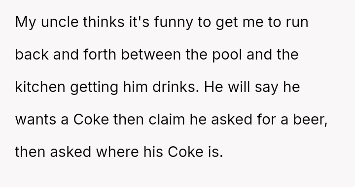 The weight of unspoken frustration hung heavy in the air each time the uncle’s demands echoed between the pool and kitchen, a cruel game masked as humor.