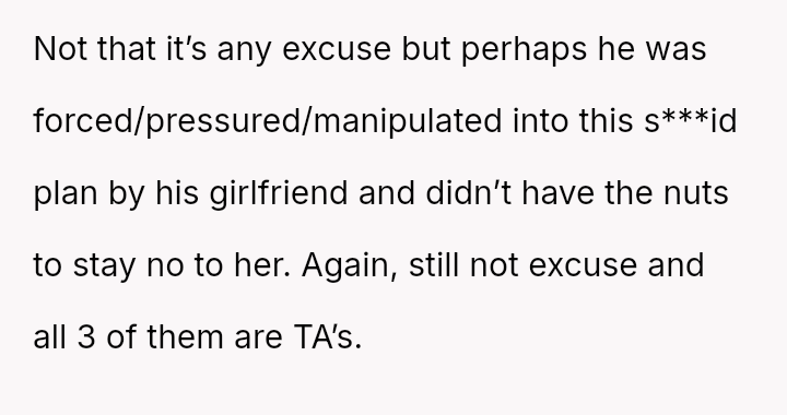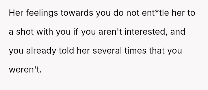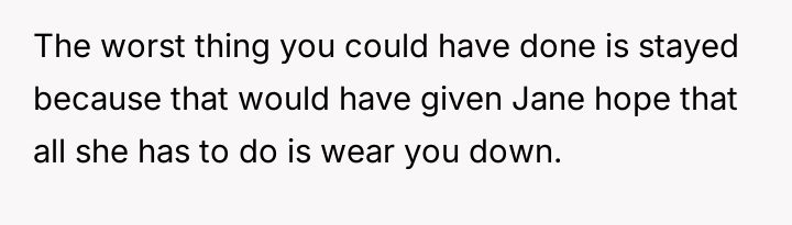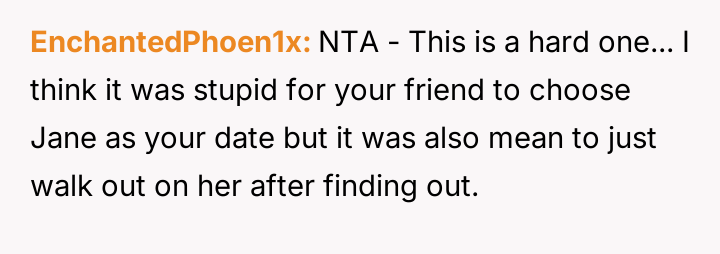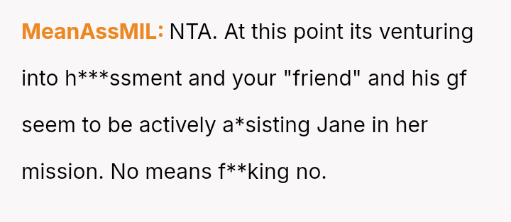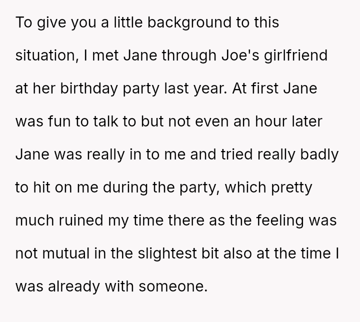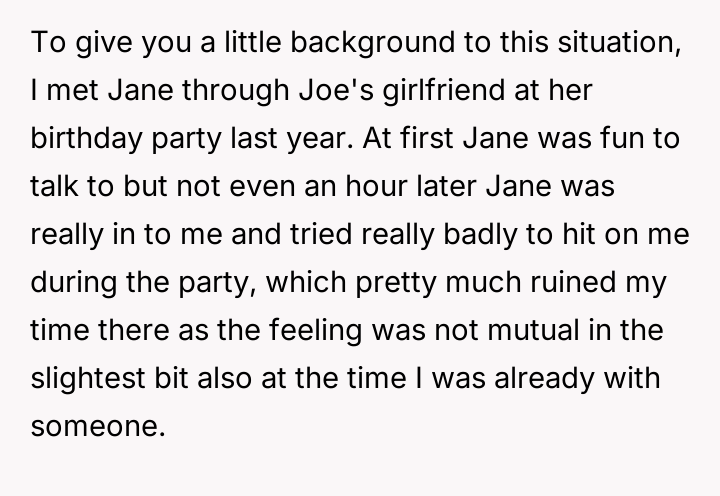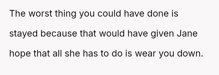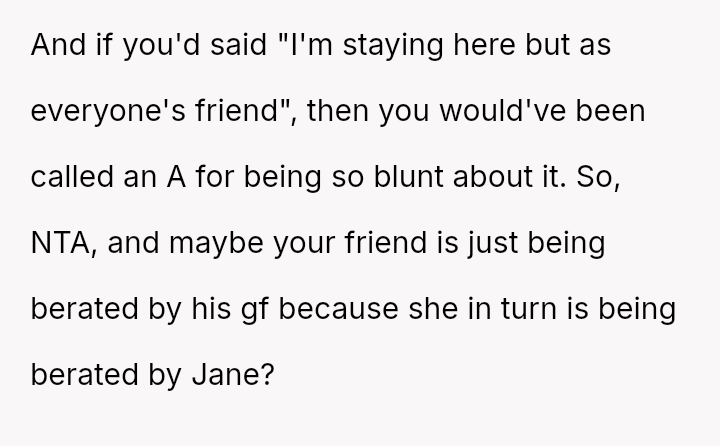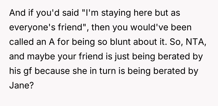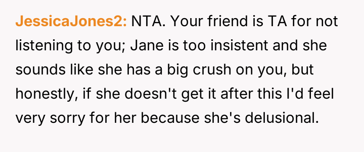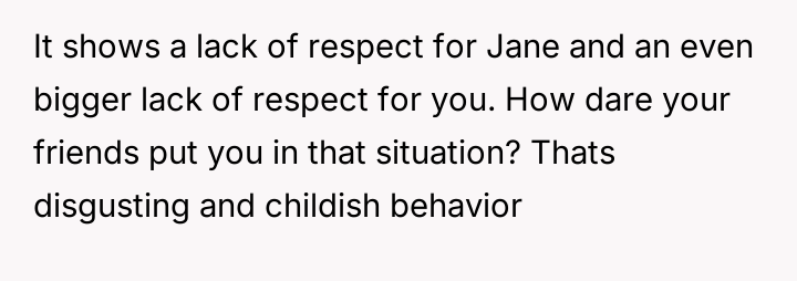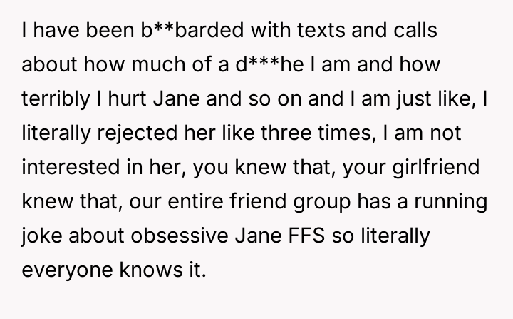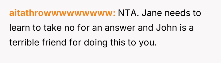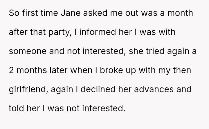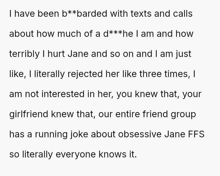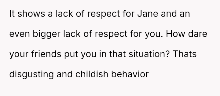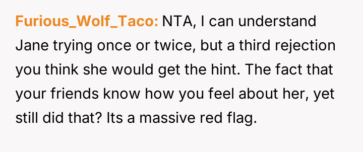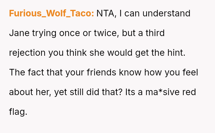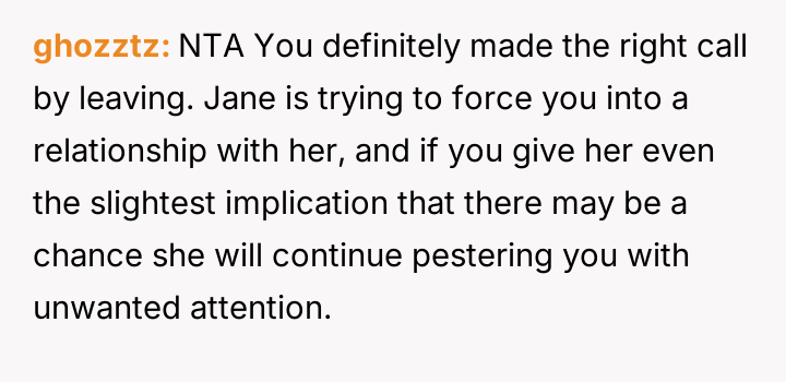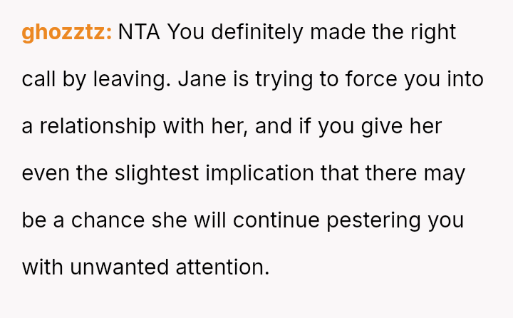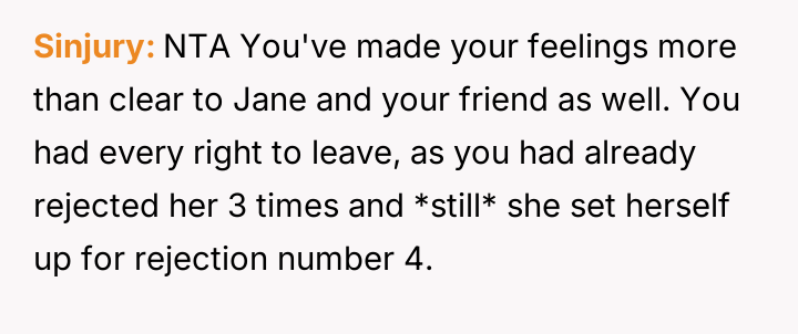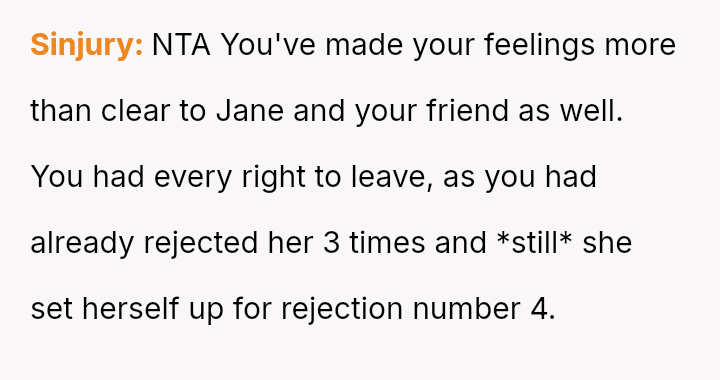 Considering the repeated, unambiguous rejections versus the deliberate orchestration of a forced intimate setting, was the OP's immediate departure a justifiable defense of their es**blished boundaries, or was it an inappropriate social reaction that unfairly hurt Jane and damaged their standing within the friend group?