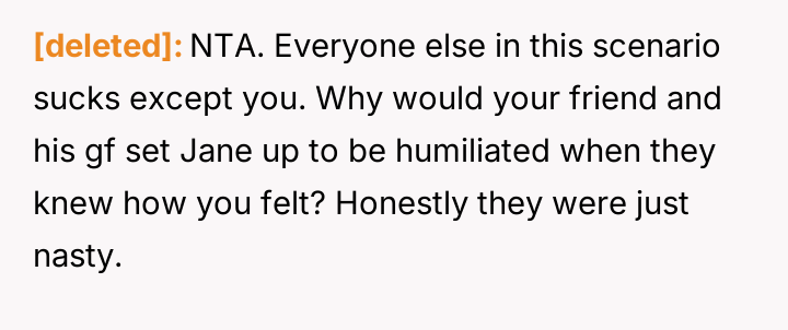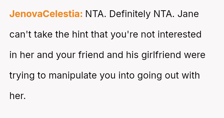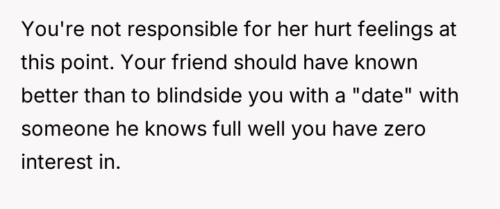 The original poster (OP) experienced extreme frustration and anger after being intentionally set up with Jane, a person they had repeatedly and clearly rejected for romantic involvement.