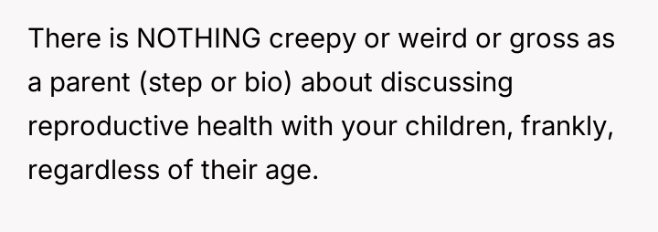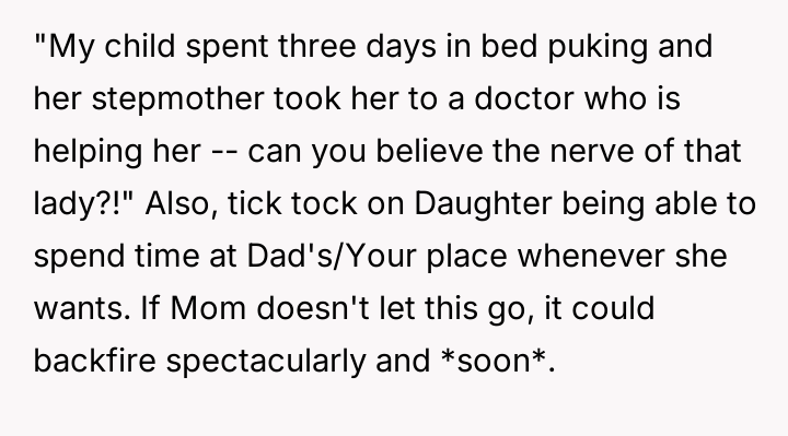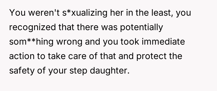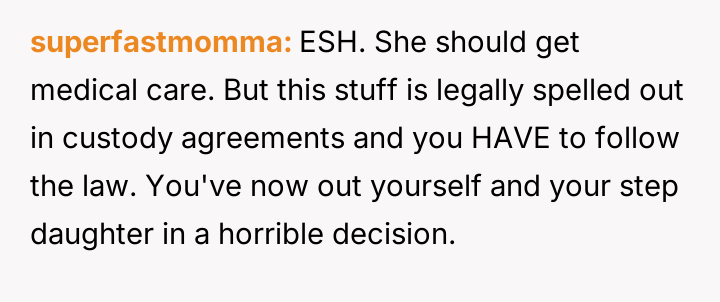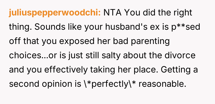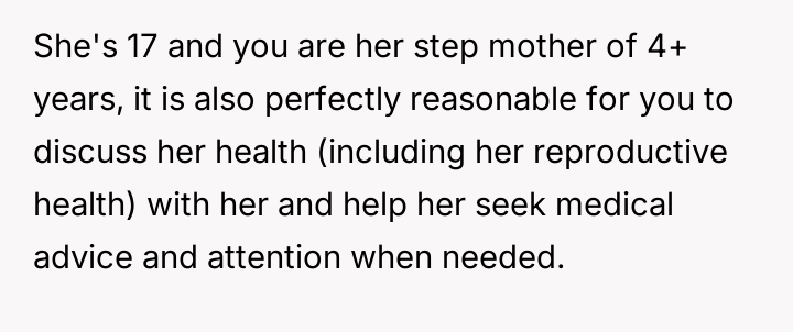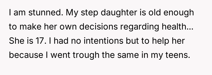 Given the clash between the OP's desire to help and the biological mother's insistence on controlling health decisions, is the stepdaughter's mother's extreme reaction justified, or did the OP's intervention, supported by the minor's request, es**blish a necessary boundary for the stepdaughter's well-being?