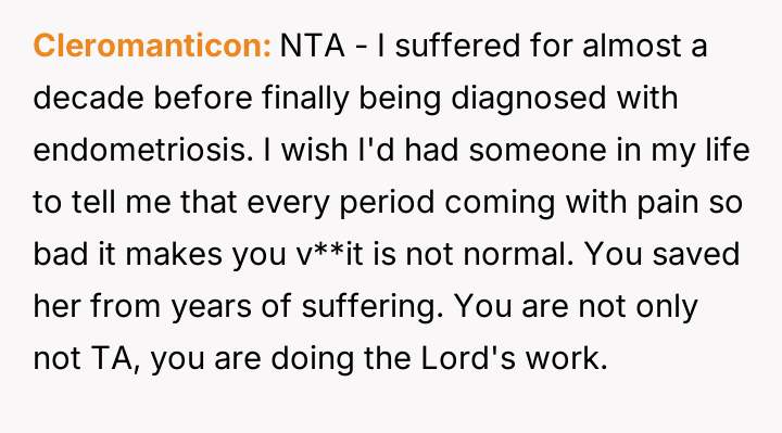 The original poster (OP) acted out of concern for her stepdaughter's severe period pain, motivated by her own past negative health experiences.