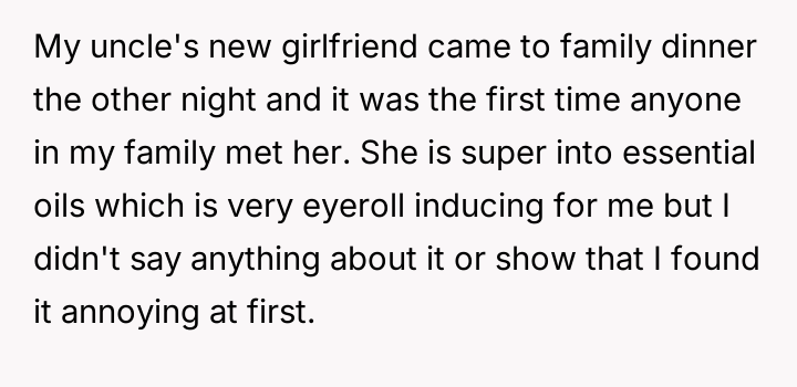 When a new presence entered the family dinner, the air was charged with unspoken tension. The uncle’s girlfriend, with her fervent belief in essential oils, ignited a silent battle between skepticism and acceptance.