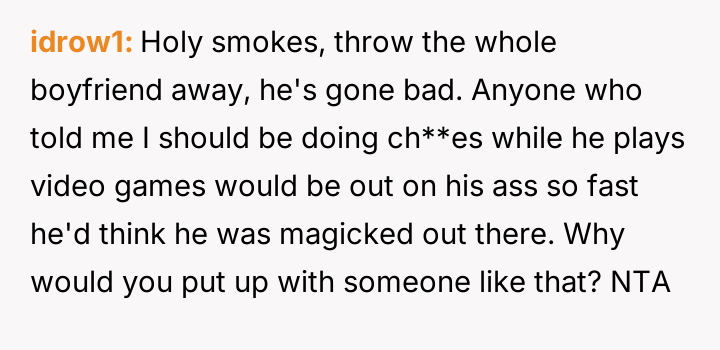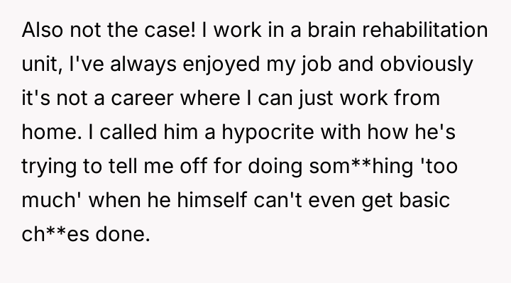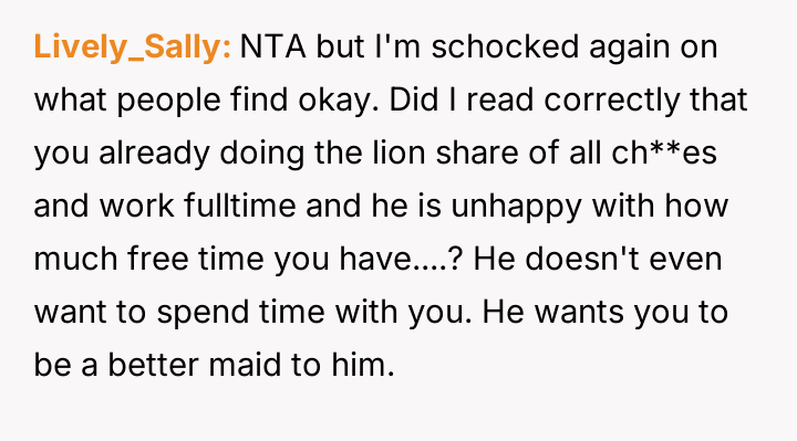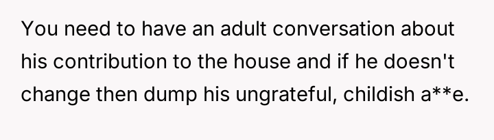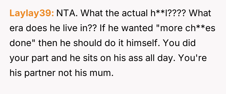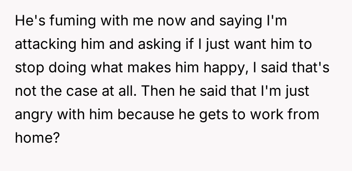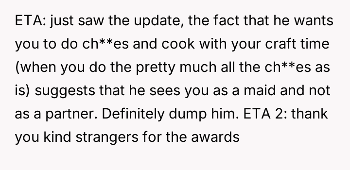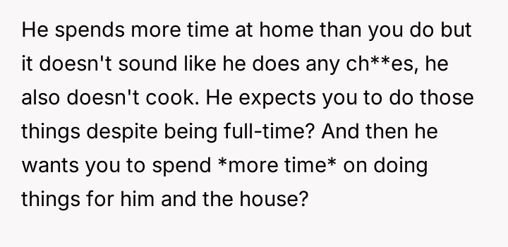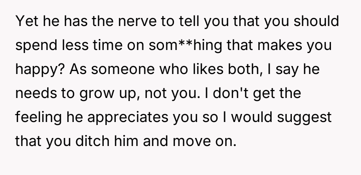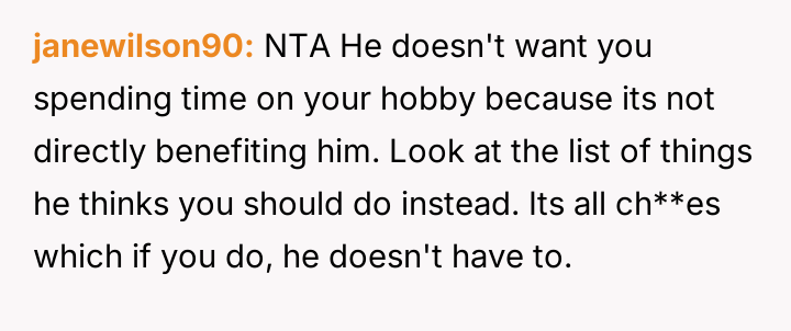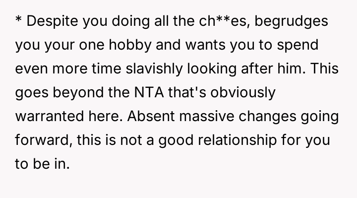 The central conflict arises from the partner's perceived hypocrisy: he criticizes her hobby time while neglecting his own share of basic ch**es, leading the OP to call him out directly.
