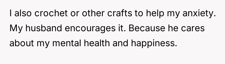 The original poster (OP) is facing a significant conflict where her partner is upset about the amount of time she spends on her anxiety-relieving hobby, crocheting, despite her fulfilling all household responsibilities first.