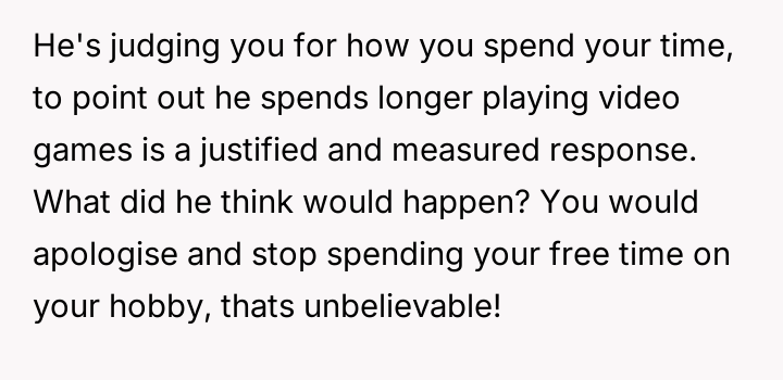 Is the OP justified in calling her partner a hypocrite for criticizing her time management and choice of hobby when he fails to meet his own domestic responsibilities, or does pointing out his failings escalate the conflict unnecessarily when her partner is simply seeking more shared time?