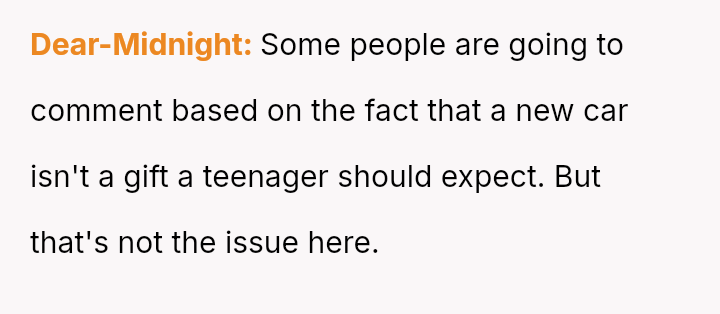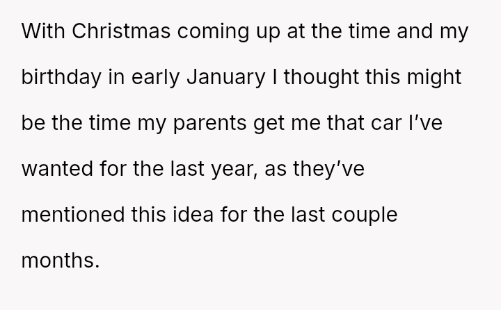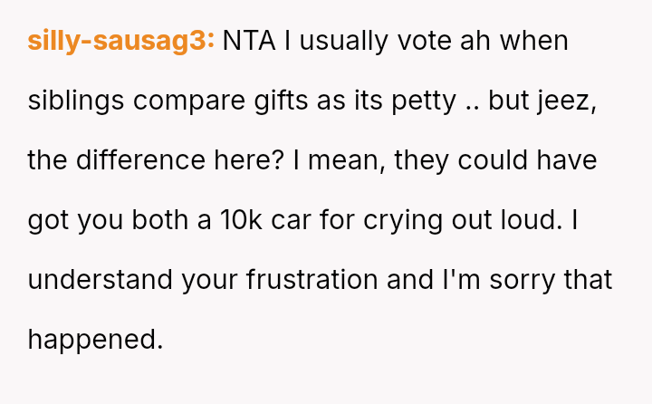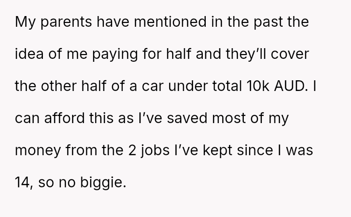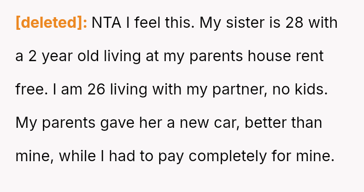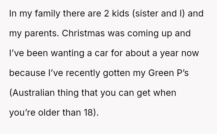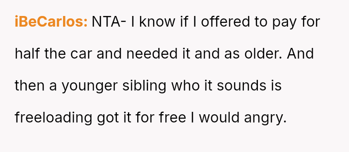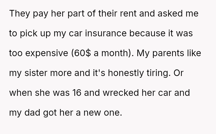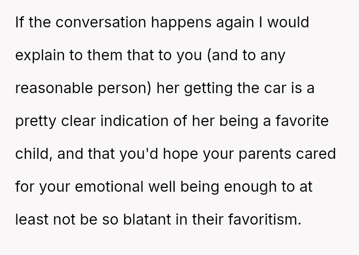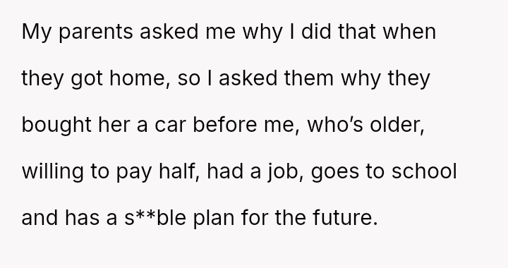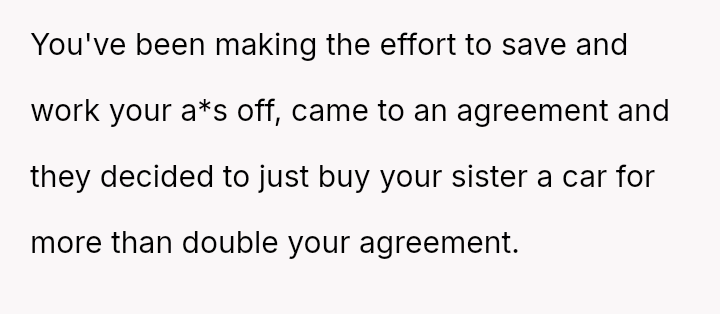 The original poster (OP) feels deeply wronged and betrayed because their parents gifted a new car to their younger sister, despite the OP having a prior agreement to co-pay for their own car, a steady job, and clear plans for its use.