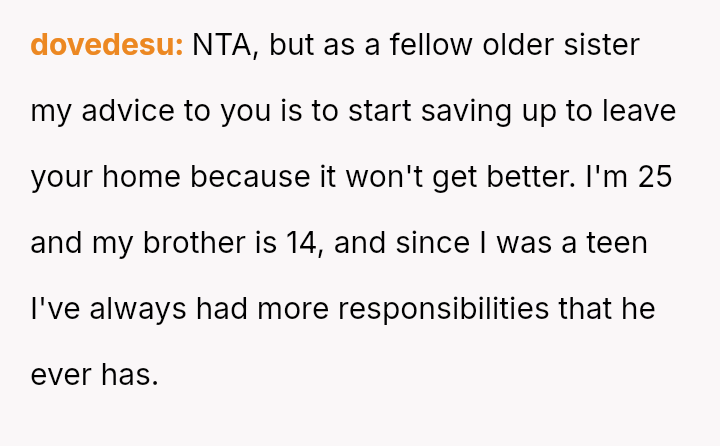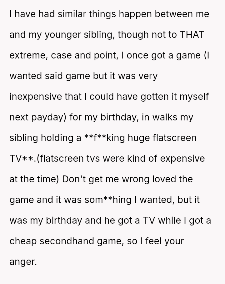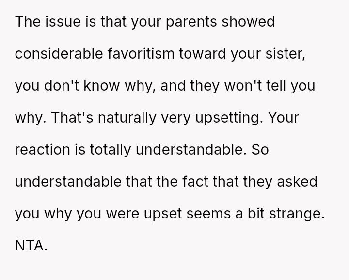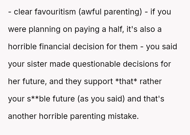 Given the OP's es**blished contribution commitment and the apparent lack of consideration for their long-term planning, the core question is whether the parents' decision represents fair parental treatment toward two children, or if it was a significant breach of an implicit promise that justifies the OP's strong negative reaction.