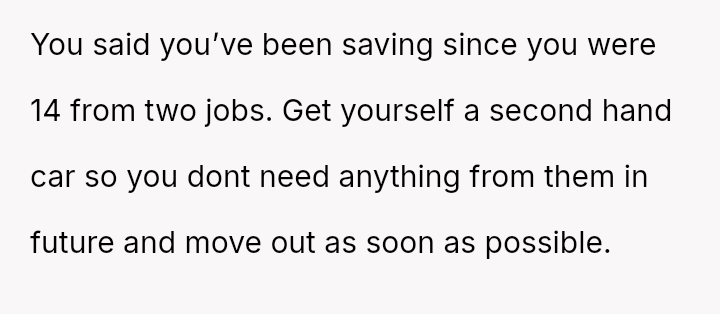 The narrator, having worked tirelessly since age 14, dreamed of independence symbolized by a car—som**hing earned through years of sacrifice and responsibility.